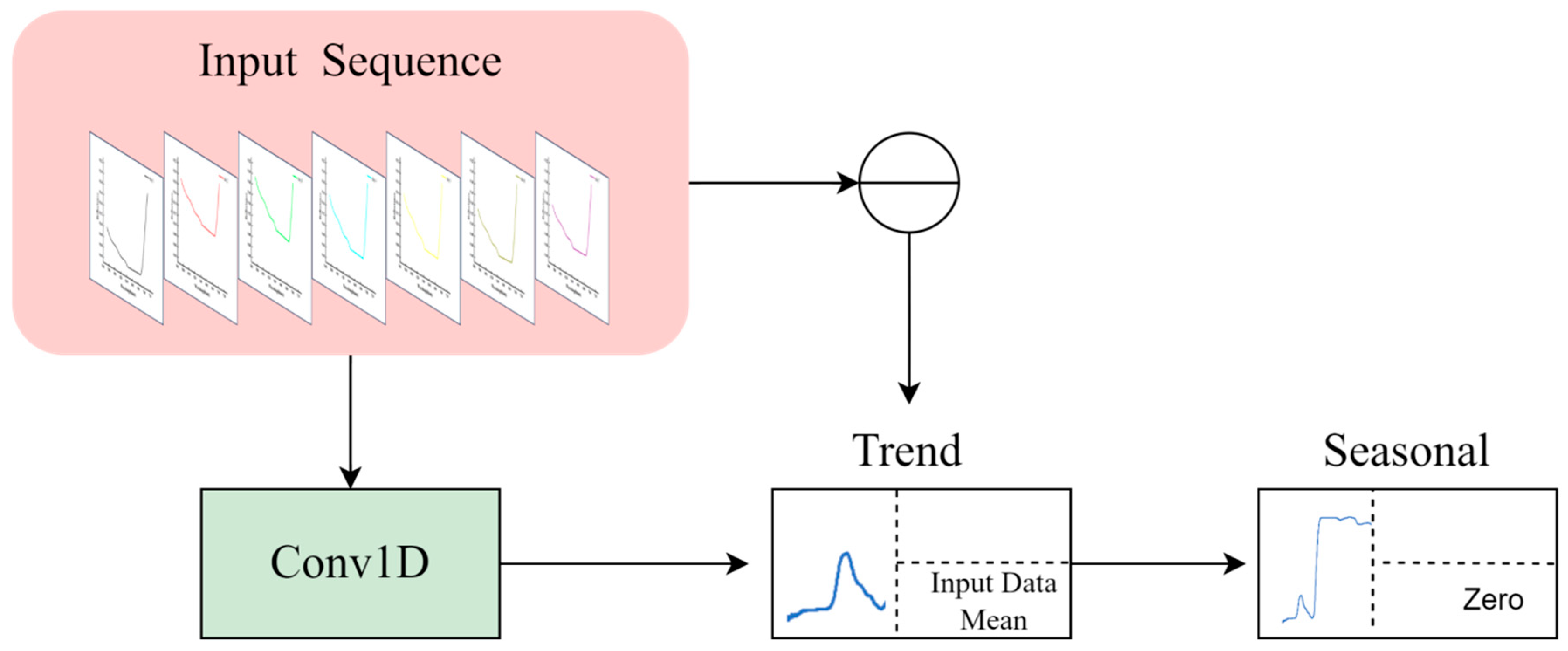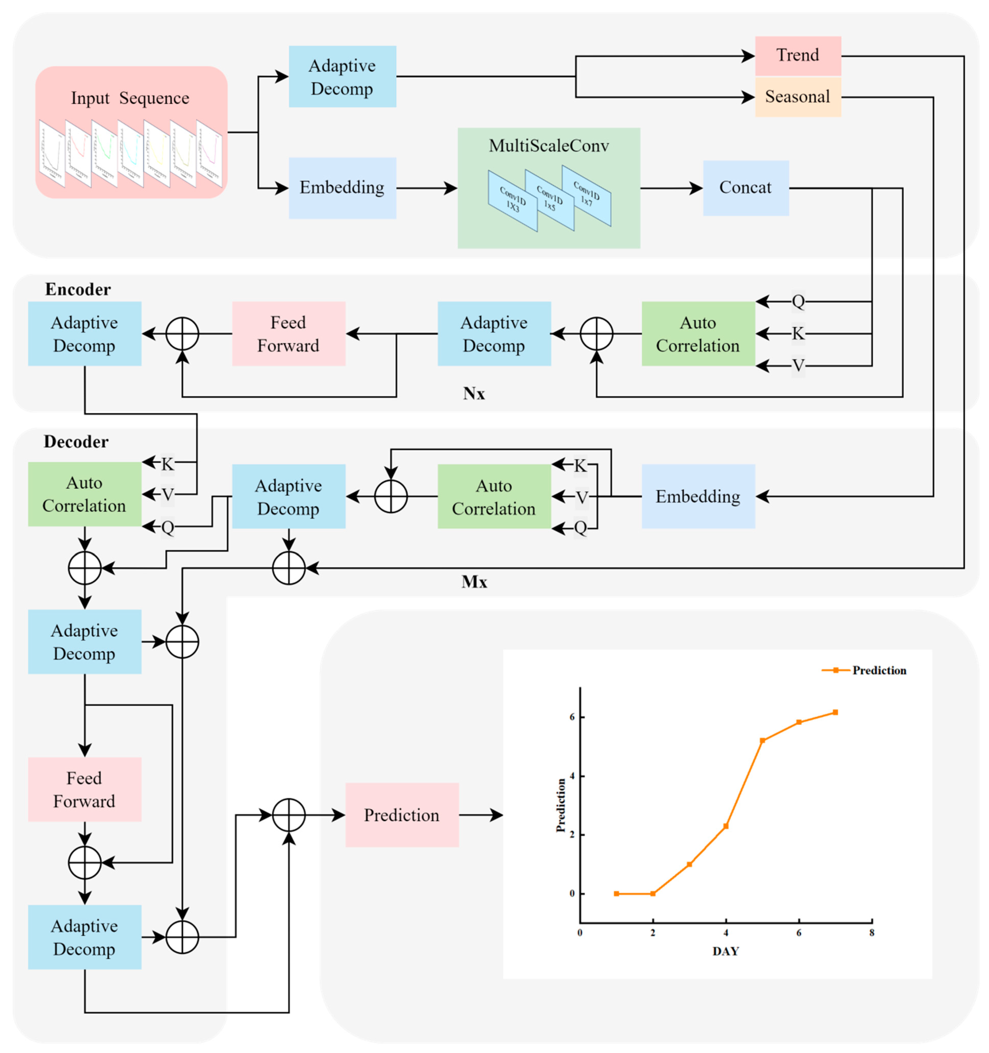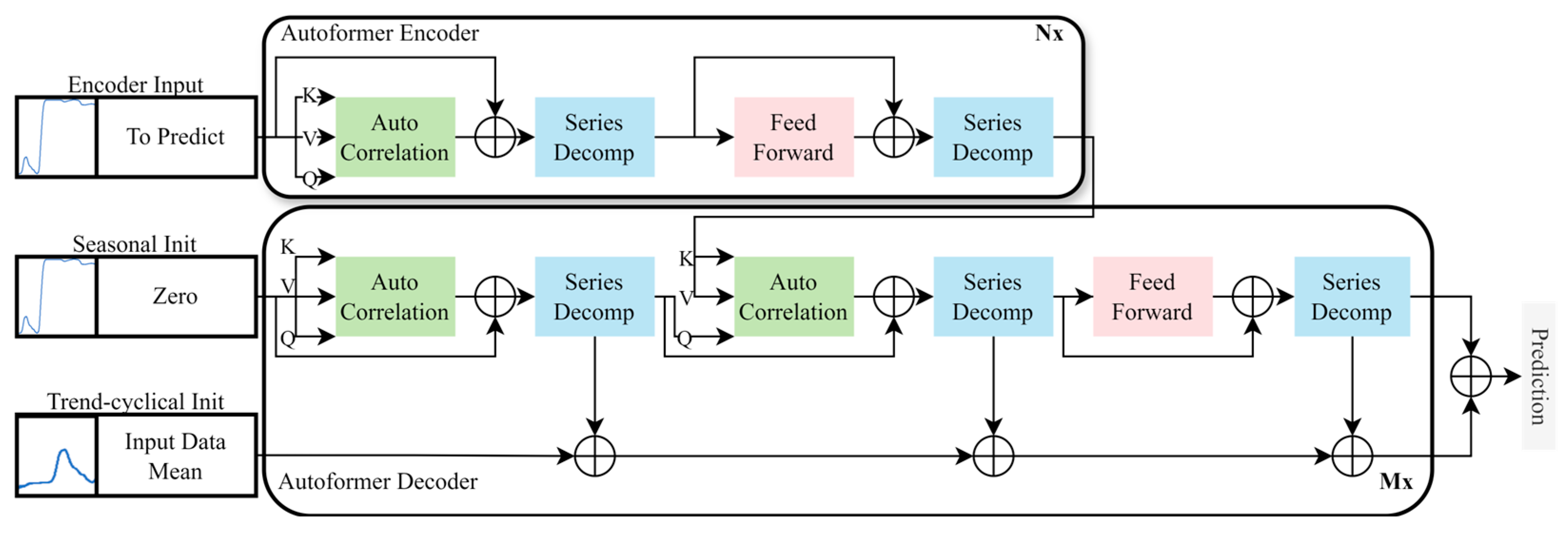 - Wu, H.X.; Xu, J.H.; Wang, J.M.; Long, M.S. Autoformer: Decomposition transformers with auto-correlation for long-term series forecasting. Adv. Neural Inf. Process. Syst. 2021, 34, 22419–22430. [Google Scholar]