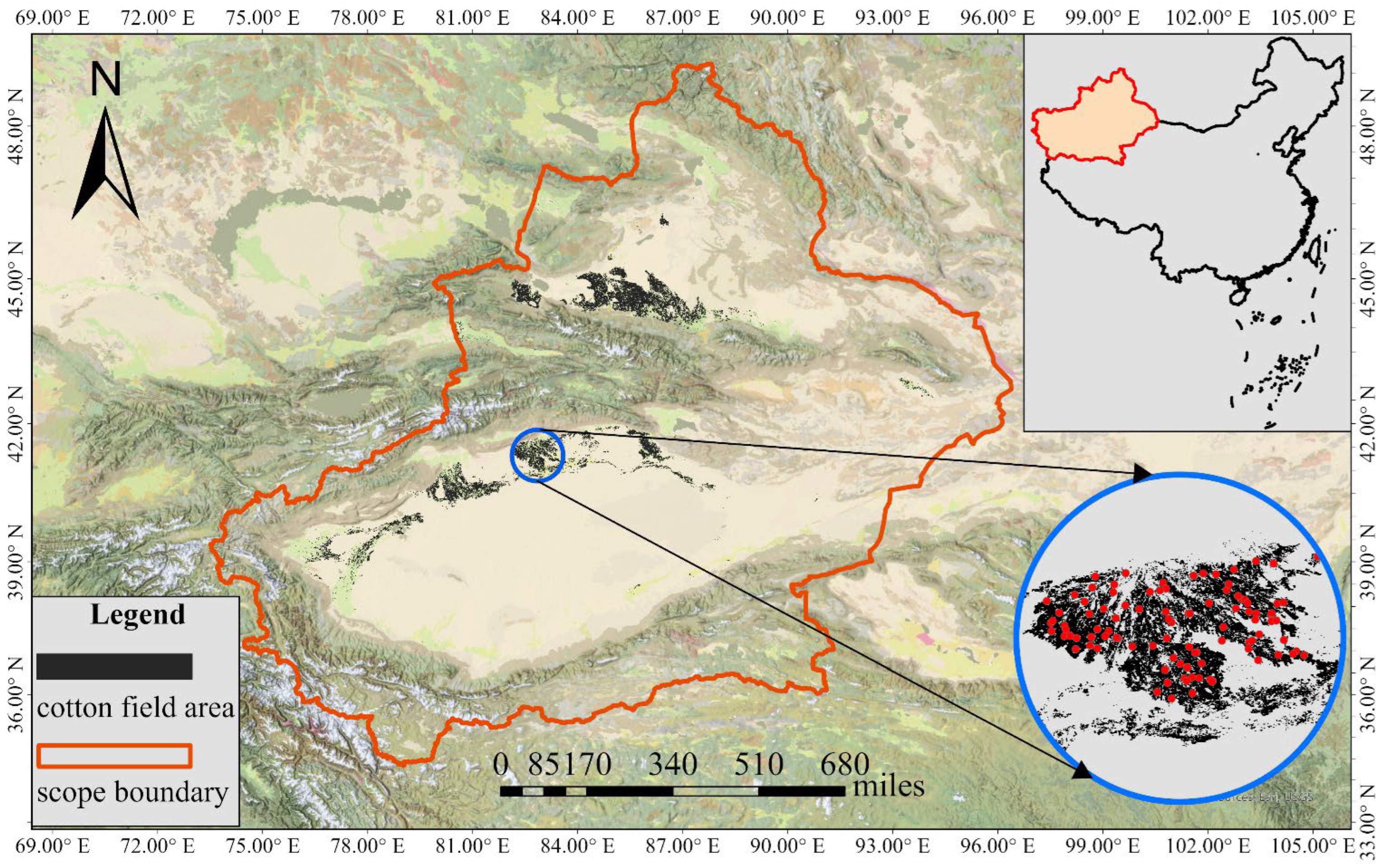 Figure 1, where black areas denote cotton field distribution in Xinjiang.