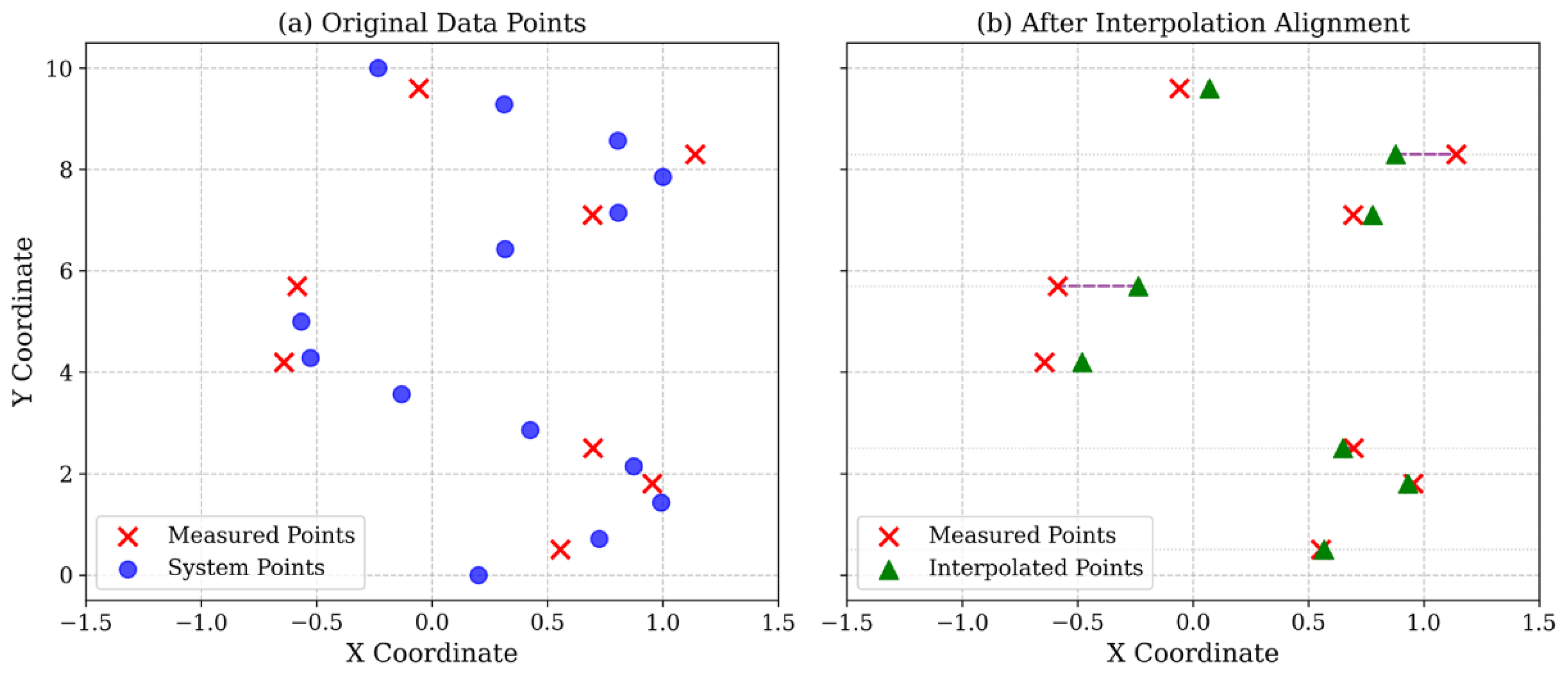 - Intra-interval interpolation: For each LiDAR timestamp , the linear interpolation Formula (4) was applied.where denotes the RTK value at time , denotes the RTK value at time , and denotes the time–progress ratio (0–1).
