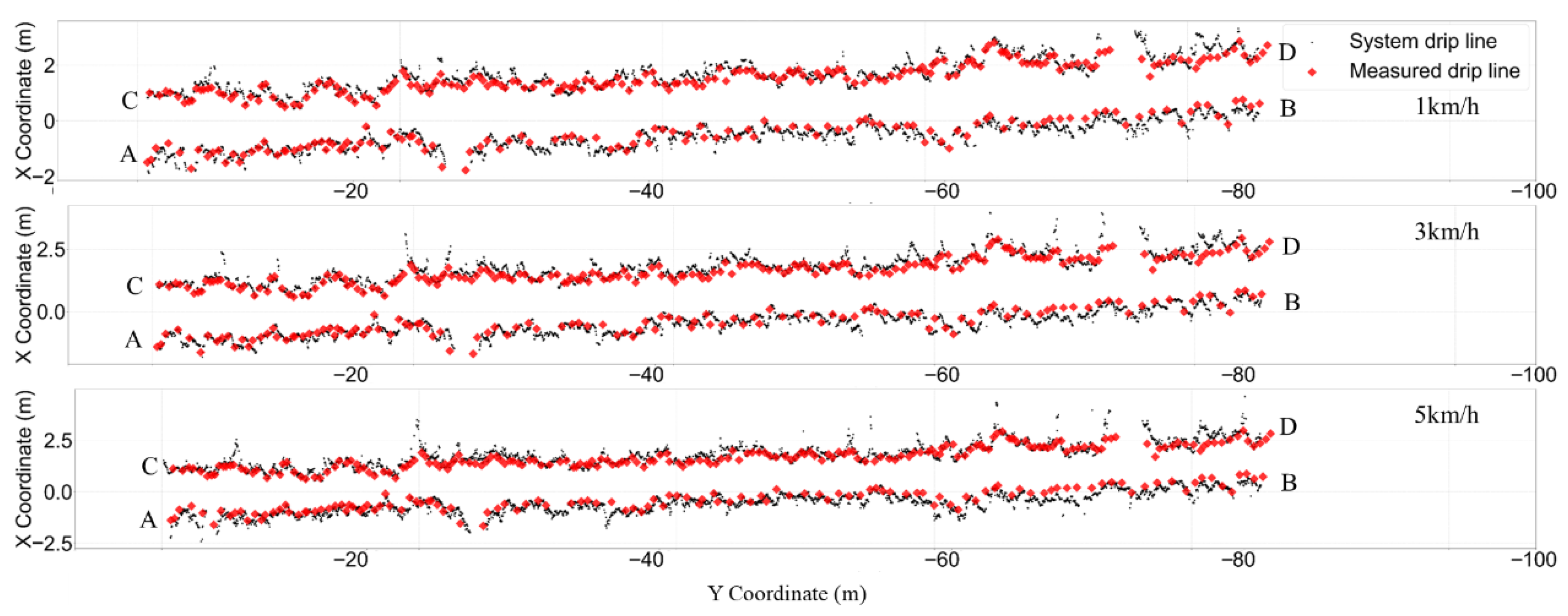 | Dripline Segment | Speed (km/h) | RMSE (m) | MAE (m) | MaxAE (m) |