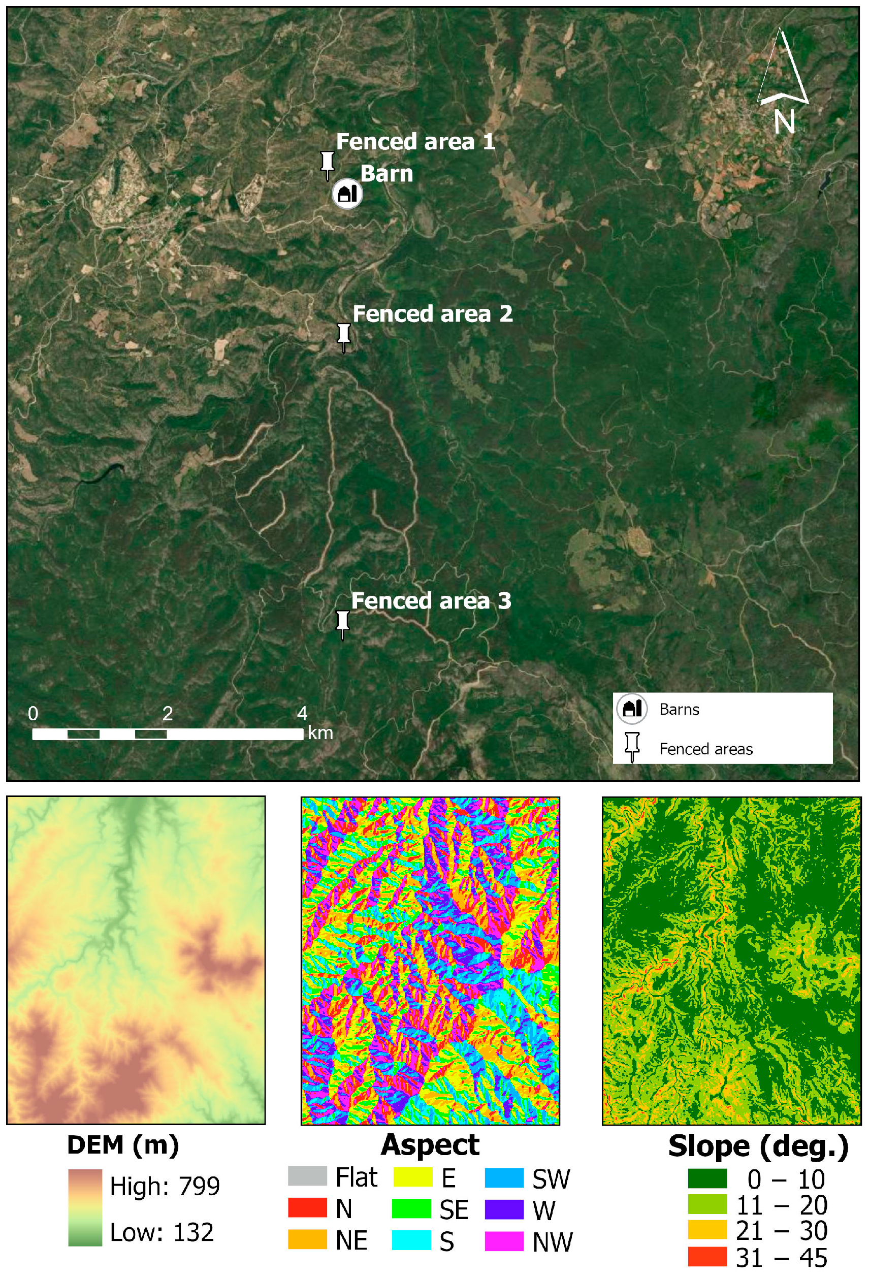 During 2010, the duration and distances of goats’ trajectories were much shorter in summer than in spring and autumn. Between these two seasons, duration was similar, but distances were longer in autumn, while movement speed was highest in autumn and lowest in spring and summer. In spring 2010, when goats were in early lactation and had high nutrient requirements, the shepherd supplied them with supplementary feed and allowed extensive grazing, resulting in long durations and low speed. In summer 2010, goats were in late lactation with lower nutritional needs; the shepherd-maintained supplementation but reduced grazing time by about 2.5 h per day and kept the flock in fenced area 1 (FA1) close to the barn (B), where water was available, leading to shorter distances. High temperatures also contributed to this reduction, as observed by Akasbi et al. [38] and Thomas et al. [66], who reported shorter walking distances during hot weather. In autumn, when goats were dry and no longer supplemented, their nutritional needs were met exclusively by grazing. The shepherd extended the grazing routes and moved the flock from fenced area 2 (FA2) to more distant areas with better forage, which increased both distance and speed. Similar relationships between longer routes and higher movement speed were reported by Schlecht et al. [22]. In contrast, Cheng et al. [67] found lower speeds in spring and winter in semi-arid Chinese grasslands with different vegetation and climate characteristics. Jouven et al. [43] noted that herders influence flock movement and distribution by modifying the location of shelters, while Akasbi et al. [38] similarly observed that in Southern Morocco, goats traveled longer distances in autumn to reach areas with available fodder. During 2011, contrary to 2010, goats’ trajectory duration and distances were longest in summer, intermediate in autumn and shortest in spring, while speed was highest in spring. To meet the nutritional needs of goats in early lactation, the shepherd increased supplementary feeding compared to spring 2010, keeping the flock in fenced area 1 (FA1) and providing additional alfalfa hay (400 g/animal), which resulted in shorter grazing periods. In summer 2011, although goats were still in late lactation, the shepherd stopped supplementation due to the rising prices of feedstuffs and the decline in milk value. It is generally accepted that feed costs represent the main variable expense in small ruminant farming [8,68], and the economic pressure led to longer grazing times and distances, as pasture is the most economical feed source [69]. Similar behavior was reported by Chebli et al. [17], who suggested that goats extend grazing to satisfy nutritional needs efficiently. In autumn 2011, both grazing duration and distances declined relative to summer, likely reflecting the goats’ lower nutrient needs as they were in the dry period and the shepherd’s decision to reduce range access. However, vertical distance remained comparable to summer, as the starting point of the trajectories (FA3) and surrounding terrain were steeper. Lachica et al. [29] likewise observed longer distances in summer than autumn in Mediterranean mountain rangelands, while Schlecht et al. [22] reported the opposite pattern in northern Oman. Such regional differences are expected, as herding strategies vary with forage availability and quality, vegetation type, and climatic conditions [21,38].