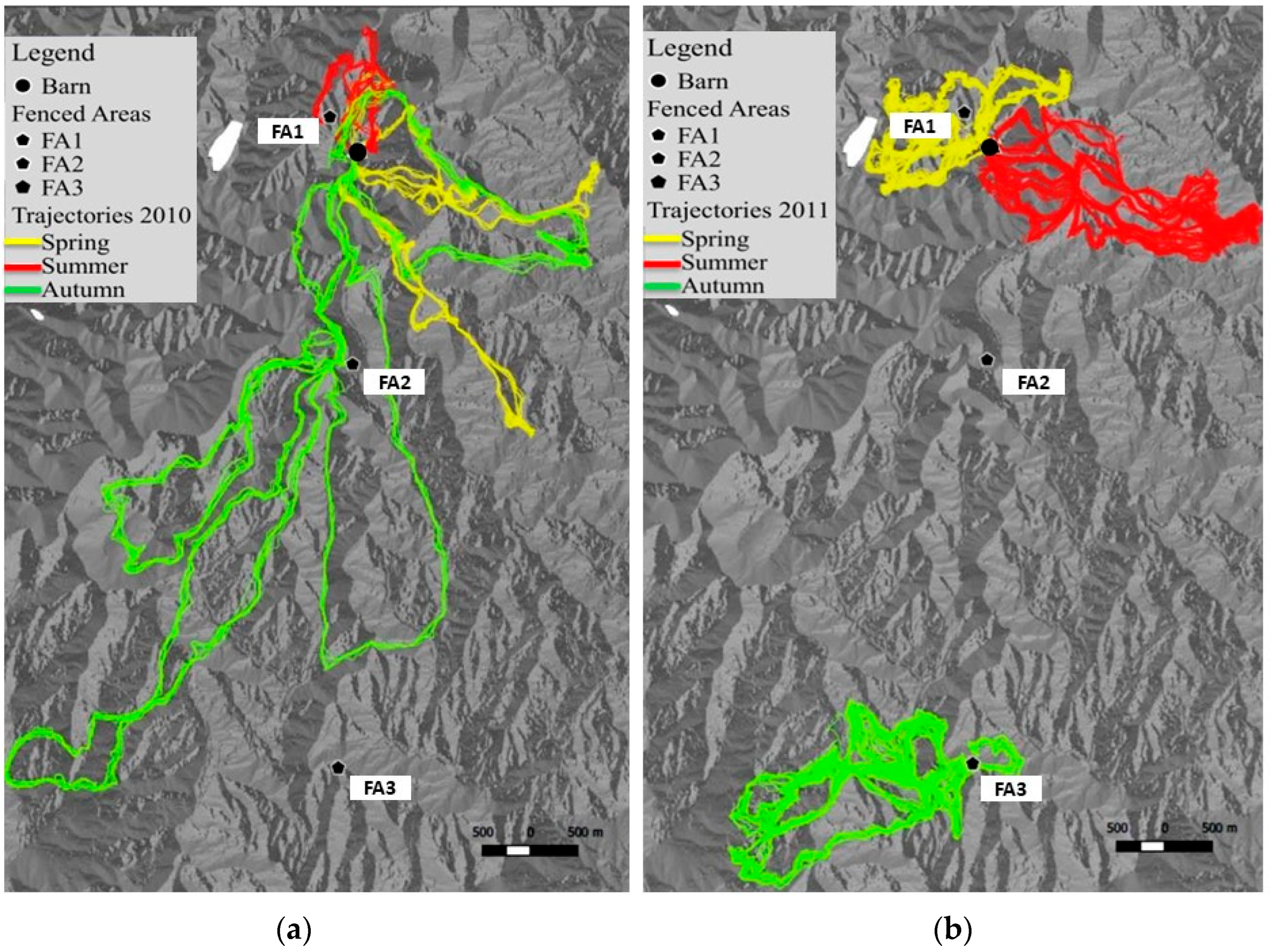 Goats’ trajectories and movement patterns in the study area during (a) 2010 and (b) 2011.