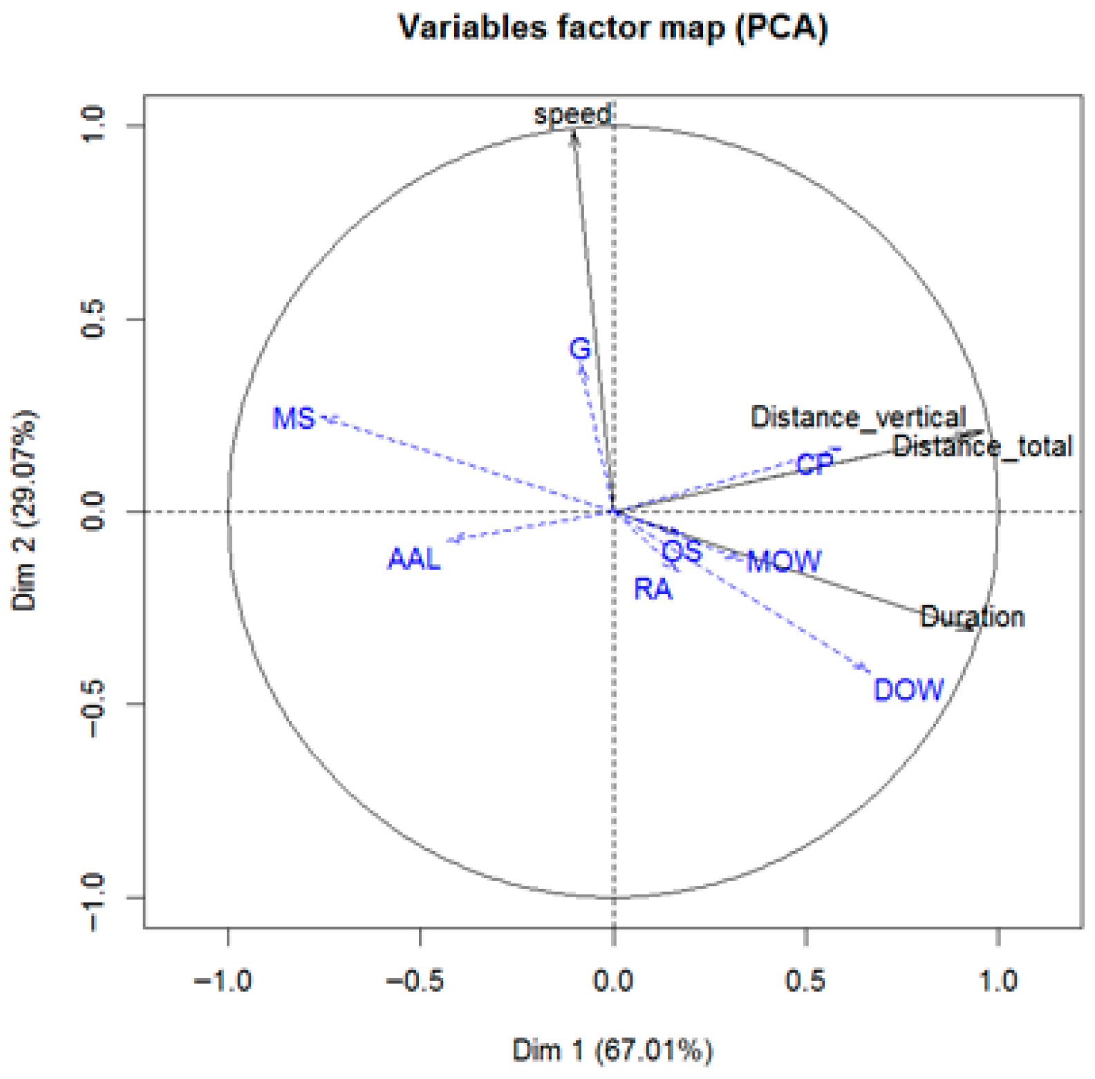Plot of variables and the PCA axes of the two first principal components (variables include: Duration, Distance_total, Distance_vertical, Speed, AAL = Abandoned agricultural land, CP = Coniferous plantation, G = Grassland, MOW = Moderate oak woodland, DOW = Dense oak woodland, RA = Riparian area, OS = Open shrubland, MS = Moderate shrubland). Names of explanatory variables are in italics.
