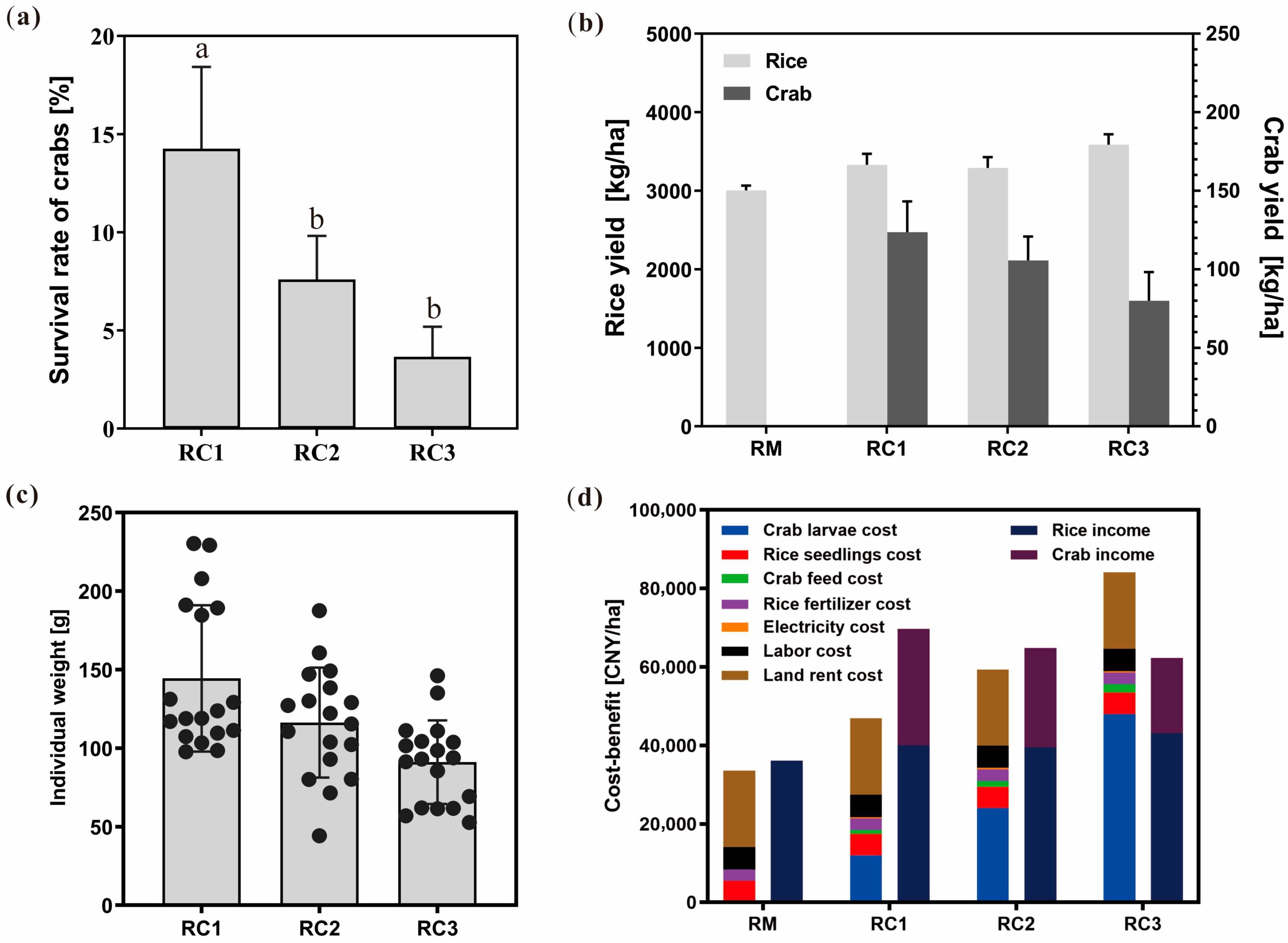 Figure 1. Rice and crab production in the SARC system. (a) Survival rates of crabs under different stocking densities. (b) Comparative yields of rice and crabs under different stocking densities. (c) Individual weight of crabs under different stocking densities. (d) Cost–benefit analysis of rice and crab production under different stocking densities. RC1_6000 ind/ha, RC2_12000 ind/ha, and RC3_24000 ind/ha. Different superscripts denote significant differences between treatments (p < 0.05).