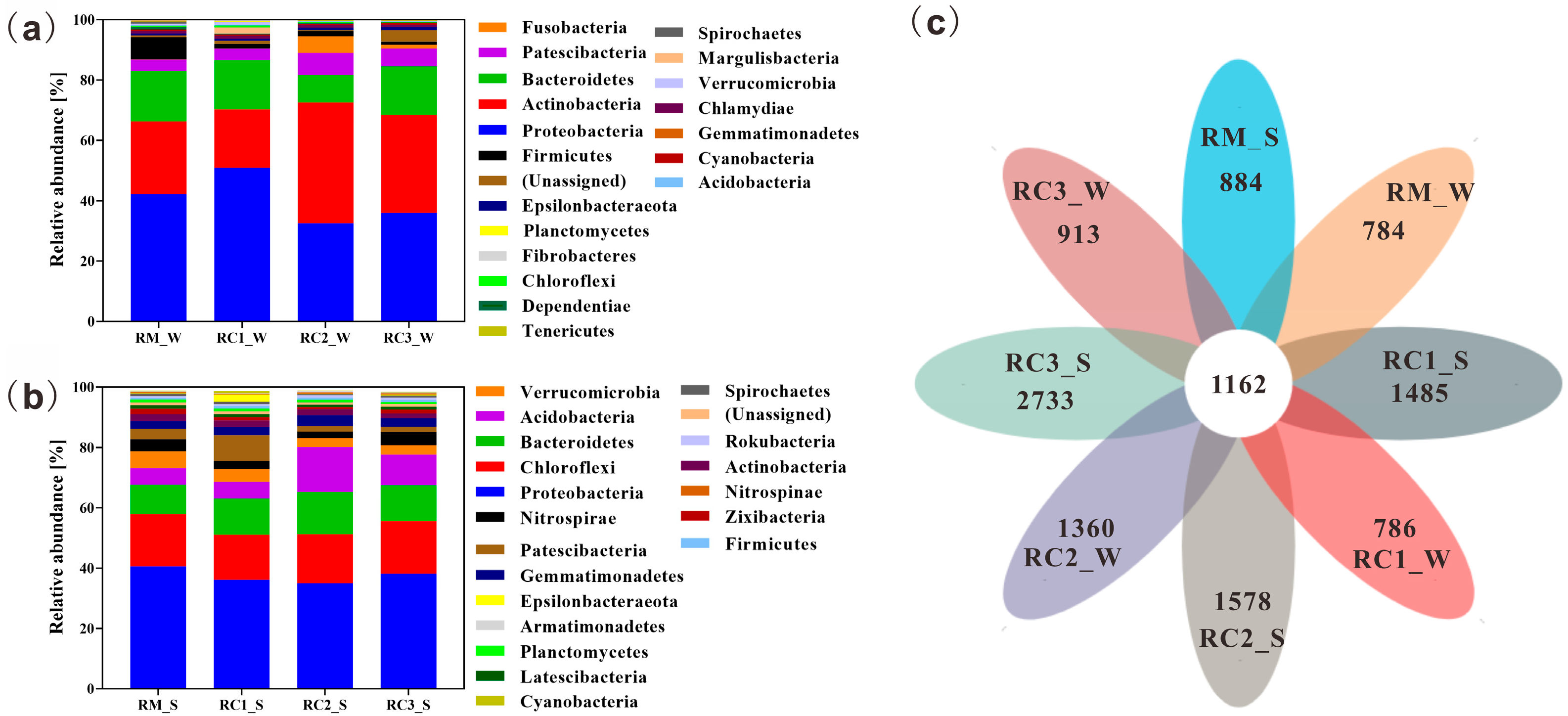 The composition and structure of a microbial community in water and soil were determined. The dominant phylum in the water and soil samples varied. From Figure 3a, the top 10 phyla in water samples were Proteobacteria, Actinobacteria, Bacteroidetes, Patescibacteria, Firmicutes, Fusobacteria, Chlamydiae, Epsilonbacteraeota, Margulisbacteria, and Cyanobacteria, respectively. Whereas in soil samples, Proteobacteria, Chloroflexi, Bacteroidetes, Acidobacteria, Verrucomicrobia, Patescibacteria, Nitrospirae, Gemmatimonadetes, Actinobacteria, and Zixibacteria constituted the top 10 phyla, as can be seen from Figure 3b. Among them, Firmicutes showed a significant decrease in the three RC_W groups compared with the RM_W group. While Patescibacteria, Fusobacteria, and Epsilonbacteraeota showed a significant increase in RC2_W and RC3_W groups compared with the RM group. In the soil sample, Proteobacteria, Verrucomicrobia, and Zixibacteria showed a significant decrease in the RC_S groups, compared with the RM_S group. The phylum of Bacteroidetes increased significantly in three RC_S groups. From the Venn graph in Figure 3c, there exist 1162 common OTU in SARC system, and the unique OTU counts in RC2_W and RC3_W were relatively higher than the RM_W group, while the unique counts in all three RC_S groups were higher than the RM_S group.
