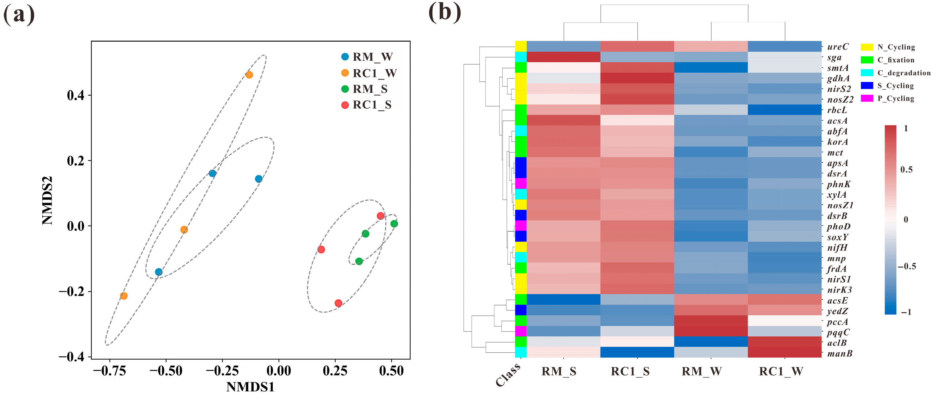 Figure 4. Microbial functional gene abundances of SARC systems. (a) Beta diversity of functional genes in water and soil samples. (b) Heatmap of gene abundance in RM and RC1 groups.