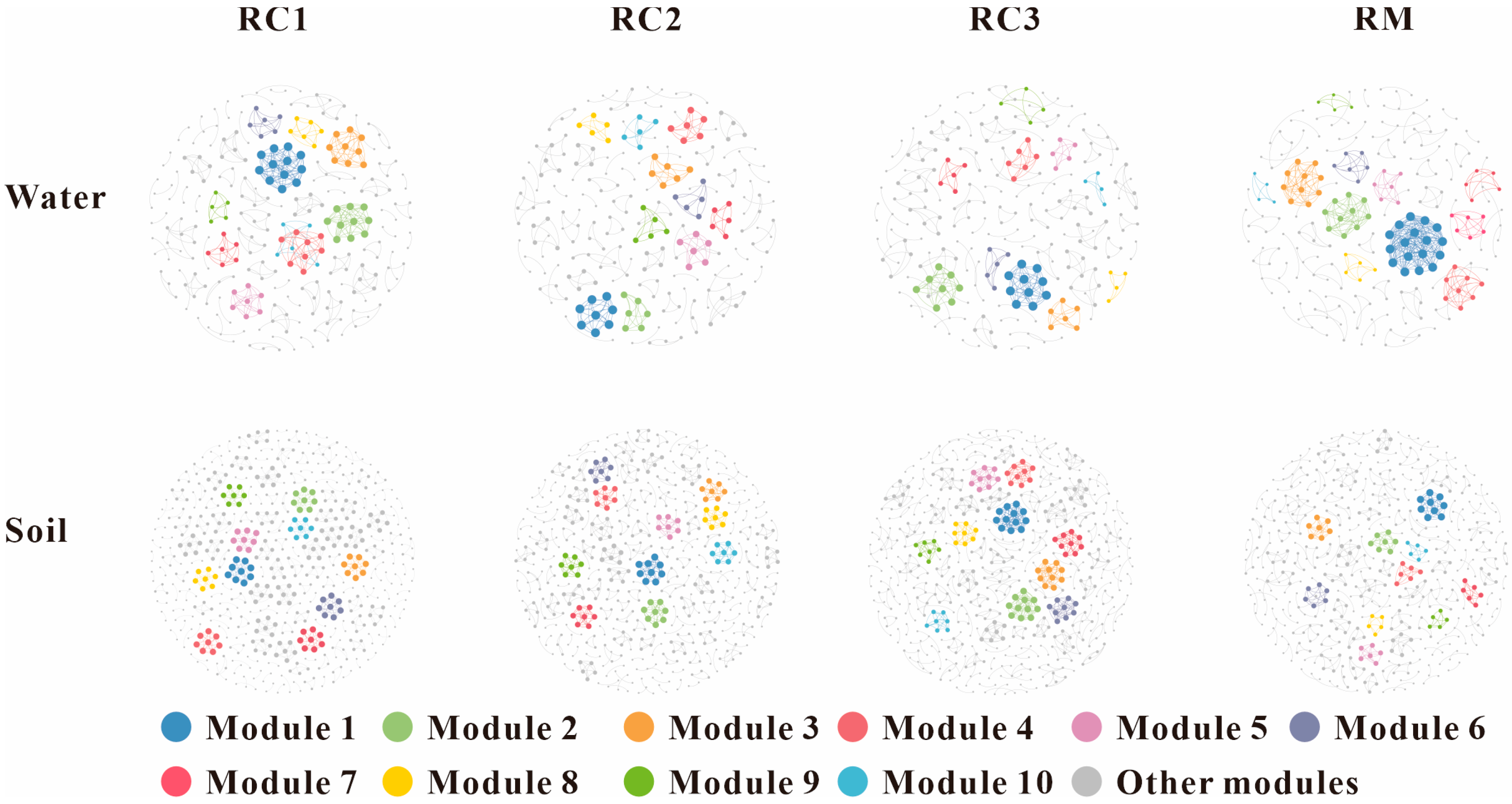 Figure 5. Modularized networks of microbial communities in soil and water of the SARC system. Each edge depicts a significant (FDR-adjusted p  < 0.01) and strong (Spearman |R| <  0.9) correlation coefficient. The node size is scaled according to the number of connections (i.e., degree). In modularized networks, the nodes were colored according to the modularity class.