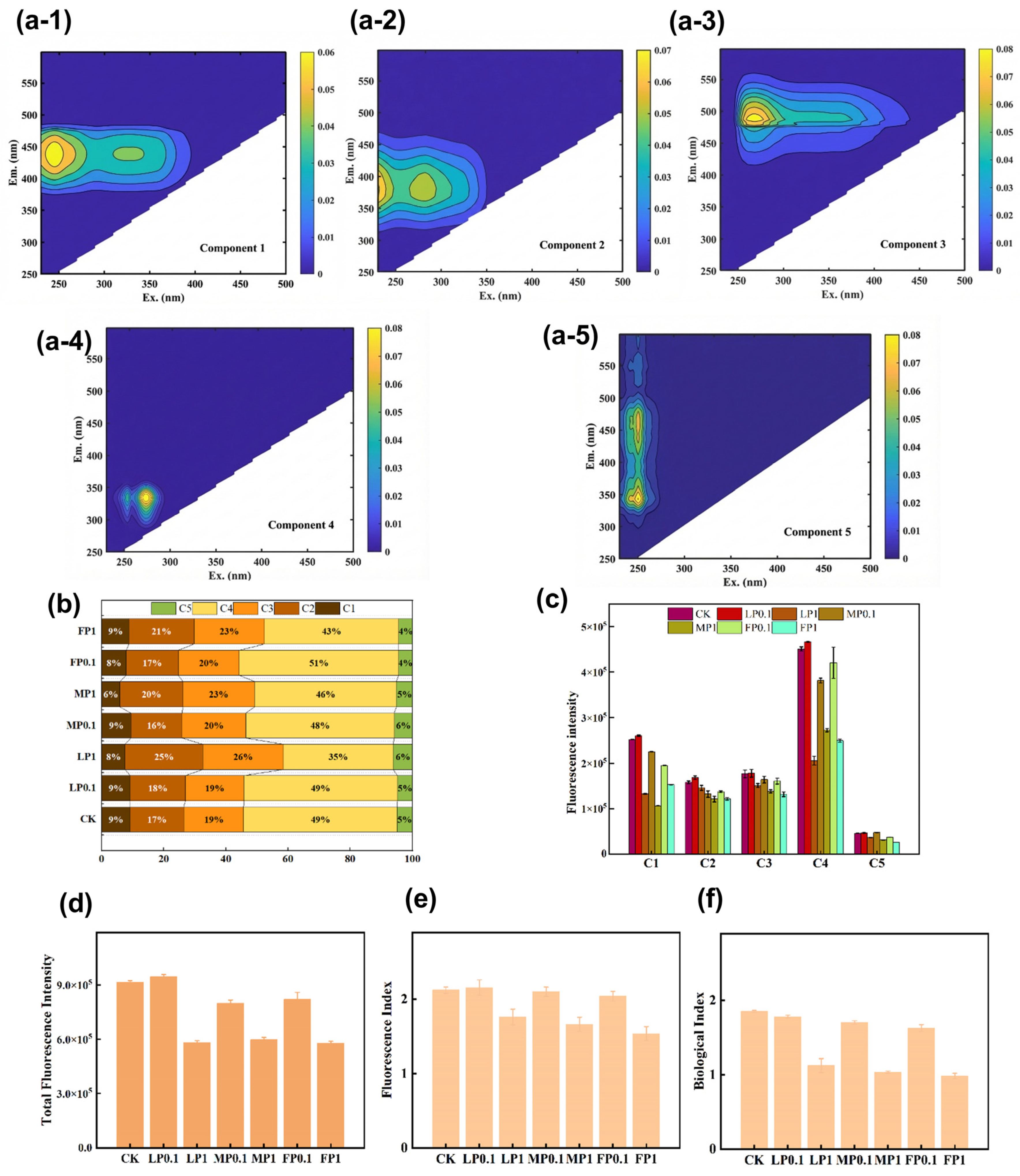 | C1, C2, C3, C4, C5 | Component 1, Component 2, Component 3, Component 4, and Component 5 of dissolved organic matter in soil |
