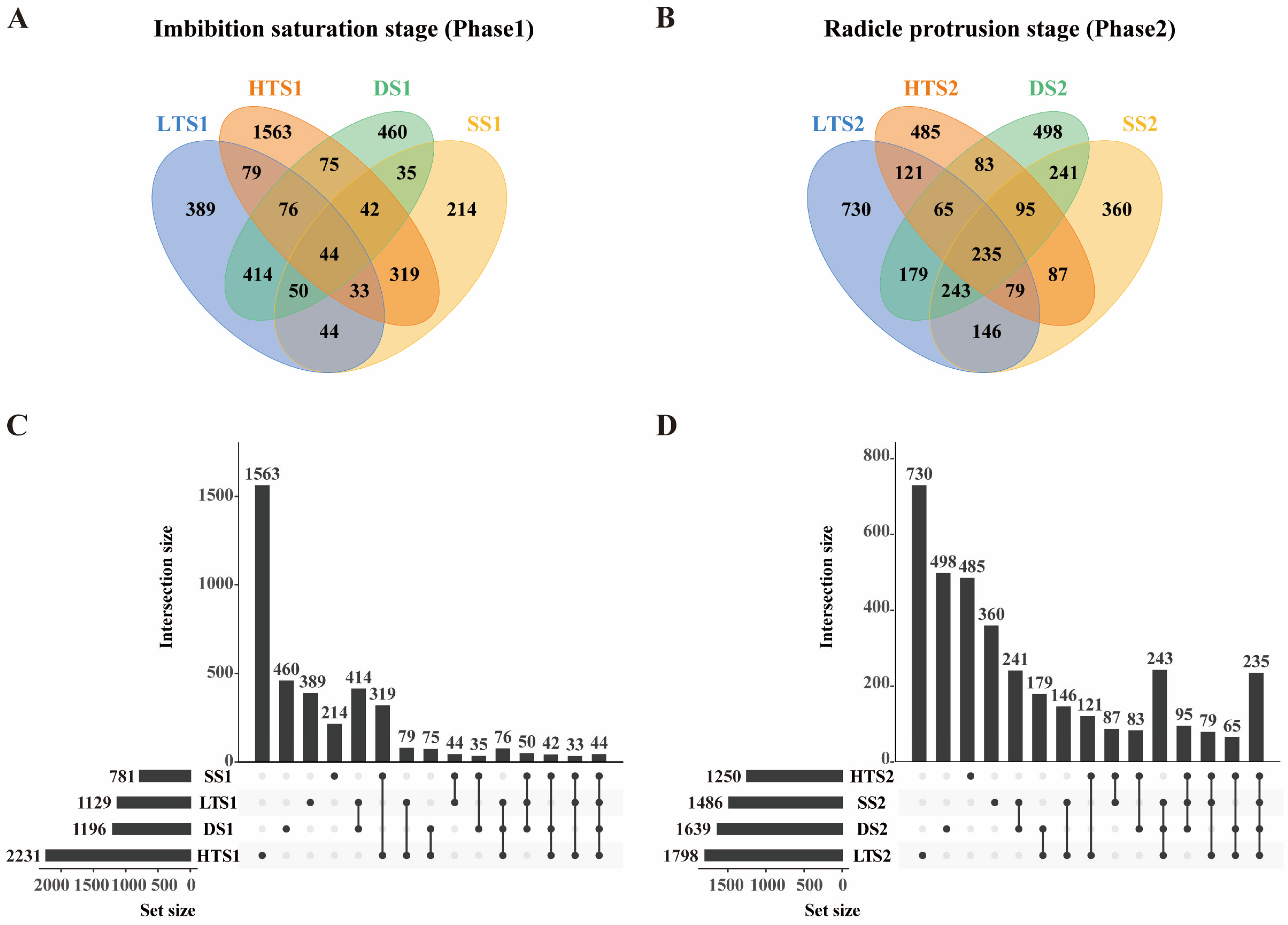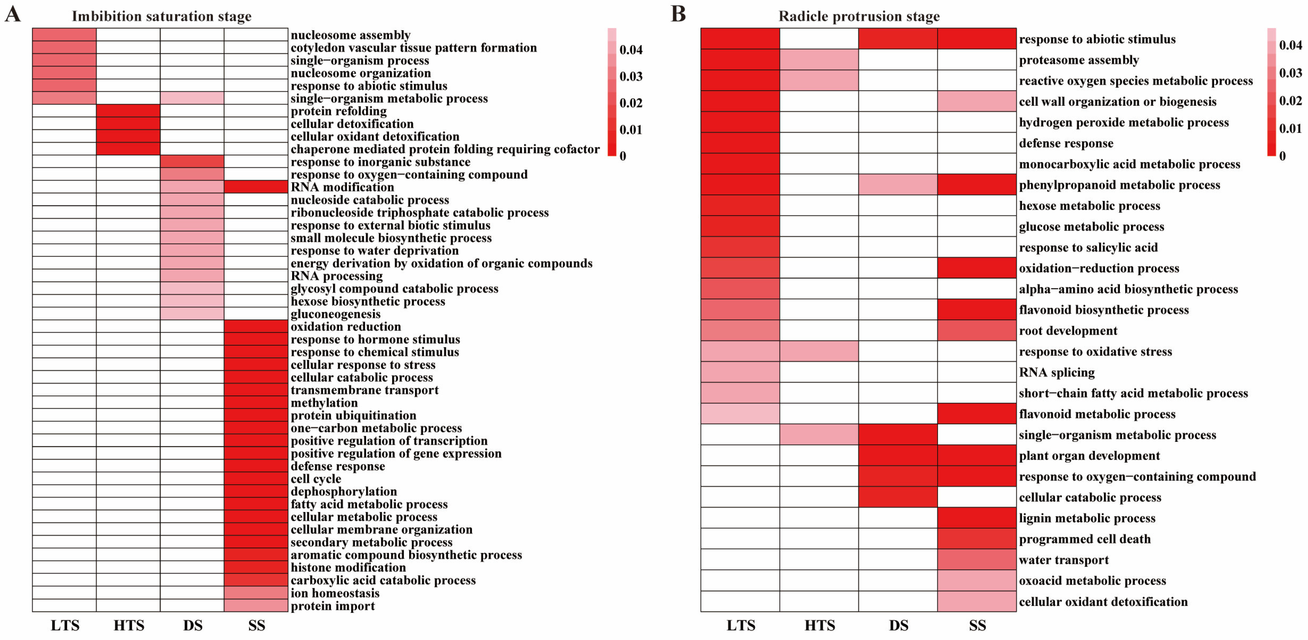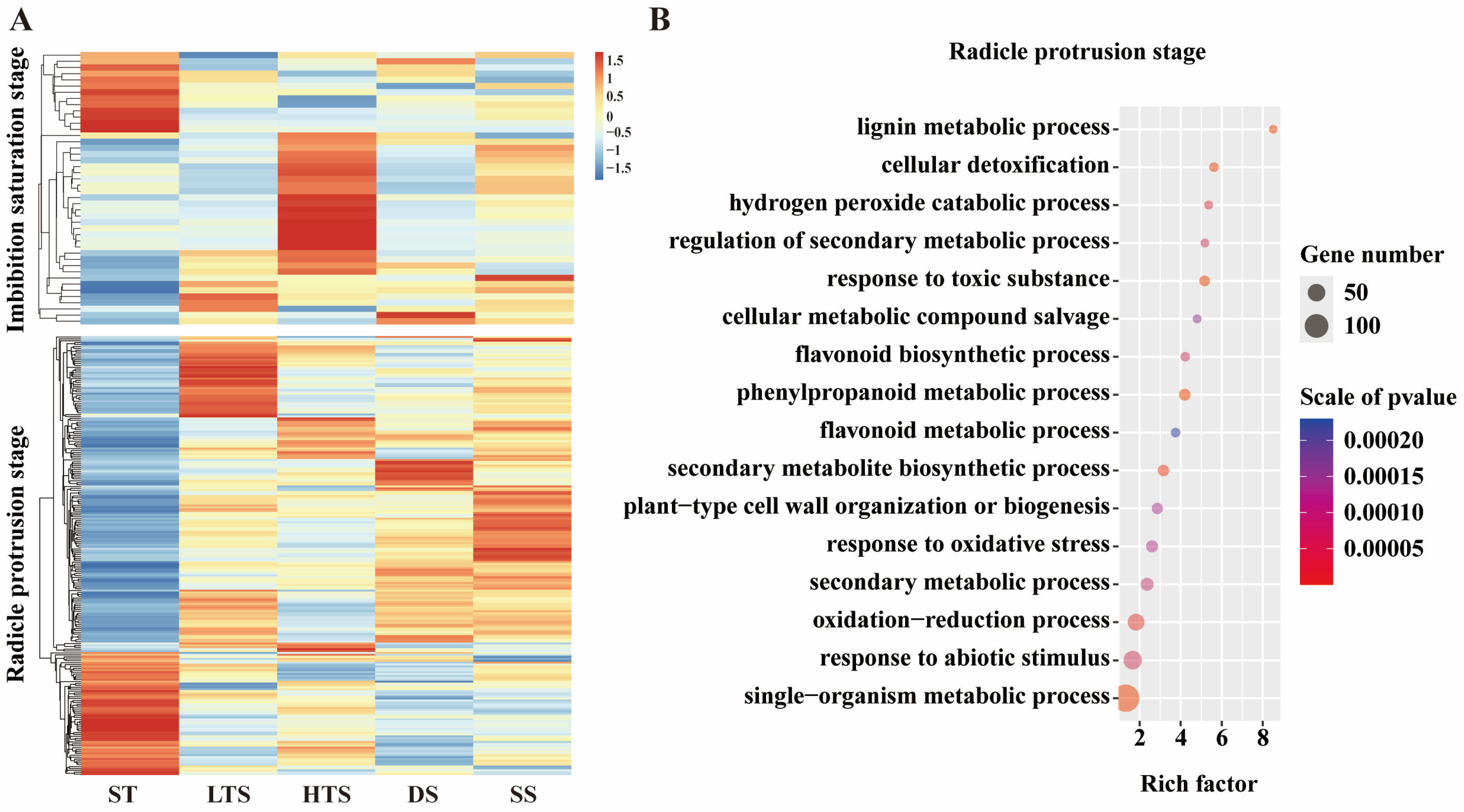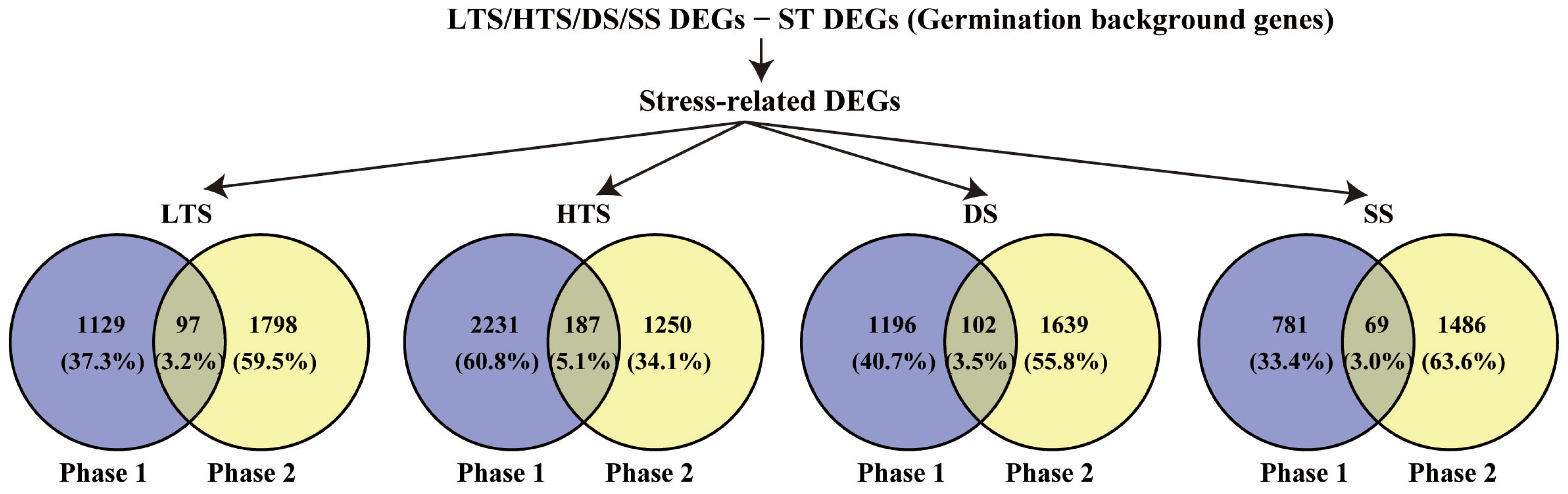 3.3. Differentially Expressed Genes Under High-Temperature, Low-Temperature, Salinity and Drought Stresses Compared to Standard Germination