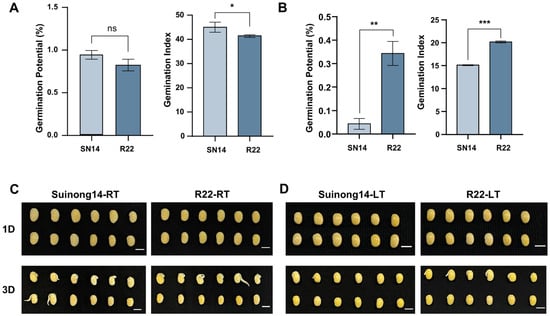 Figure 1. (A) The difference in germination potential and germination index of SN14 and CSSL_R22 at 23 °C. (B) The difference in germination potential and germination index of SN14 and CSSL_R22 at 10 °C. (C) SN14 and CSSL_R22 representative soybean seed germination at room temperature on day 1 and day 3. (D) SN14 and CSSL_R22 representative soybean seed germination at 10 °C on day 1 and day3. Data represent mean ± SE (Standard Error) (n = 3 biological replicates); ns: no significant, * p < 0.05, ** p < 0.01, *** p < 0.001 (Student’s t-test).