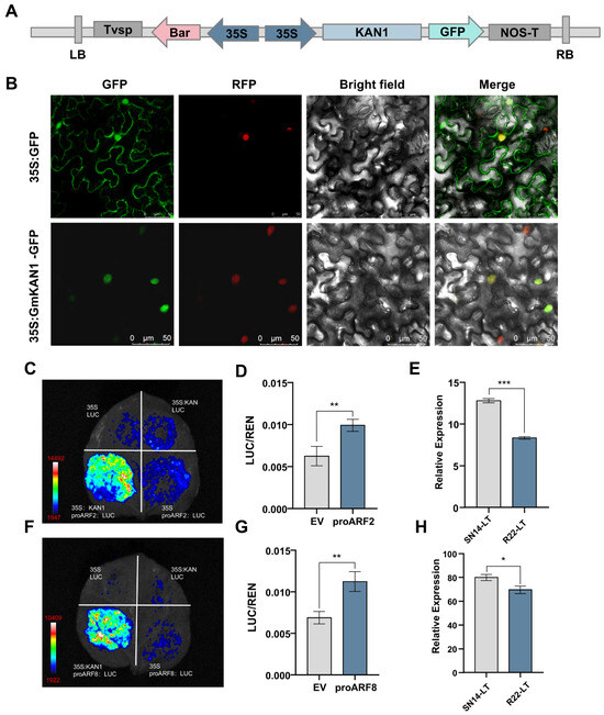 Figure 7. (A) Schematic overview of the utilized pSOY1-GmKAN1 vector, with expression elements marked with arrows. (B) Subcellular localization analyses of GmKAN1 were conducted in tobacco leaves, with confocal images showing the localization of GFP and GmKAN1-GFP. Scale Bar = 50 μm. GFP fluorescence field, RFP fluorescence field, bright field and fluorescence fusion are arranged in order. (C) Dual luciferase reporter system validation of GmKAN1 binding to GmARF2. The upper left, upper right, and lower right panels represent control groups, while the lower left panel shows the experimental group. (D) Statistical comparison of LUC/REN values between the control group and the experimental group. (E) The relative expression levels of ARF2 at SN14 low temperature and R22 low temperature. (F) Dual luciferase reporter system validation of GmKAN1 binding to GmARF8. The upper left, upper right, and lower right panels represent control groups, while the lower left panel shows the experimental group. (G) Statistical comparison of LUC/REN values between the control group and the experimental group. (H) The relative expression levels of ARF8 at SN14 low temperature and R22 low temperature. Data represent mean ± SE (Standard Error) (n = 3 biological replicates); * p < 0.05, ** p < 0.01, *** p < 0.001 (Student’s t-test).