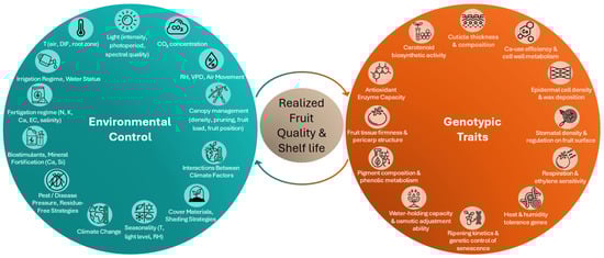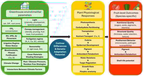 Preharvest environmental conditions strongly influence both the nutritional composition and storability of vegetables [1,2]. In greenhouse cultivation, the microclimate [i.e., temperature, light, relative air humidity (RH), CO2 concentration, and the supply of water and nutrients] can be precisely regulated. Although these parameters are typically adjusted to maximize yield, they also affect fruit physiology and biochemical composition, and thereby determine postharvest performance [3,4]. Understanding how controlled environmental factors shape fruit metabolism and structure is therefore essential for achieving both productivity and product integrity. Consumer acceptance further depends on aroma-related volatile organic compounds (VOCs), which are also influenced by preharvest climate but are beyond the primary scope of this review.