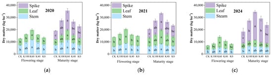 Effect of potassium application rate on (a) 2020, (b) 2021, and (c) 2024 dry matter of maize. Note: different lowercase letters indicate significant differences between treatments for each index within the same growth period. All comparisons were considered significant at p < 0.05 in the LSD test unless noted.