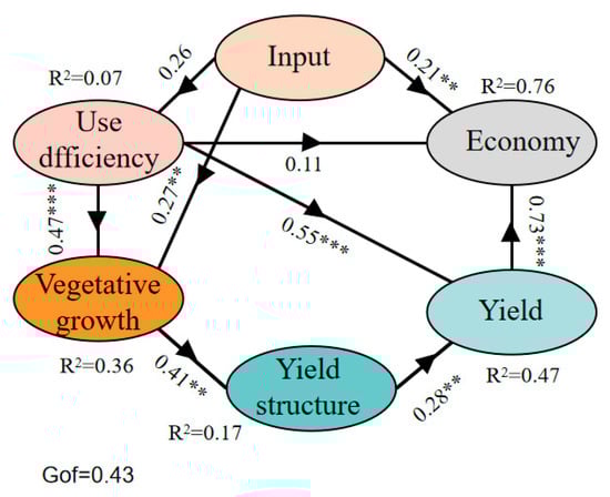 Partial least squares structural equation modeling showing the pathways through which K fertilizer use efficiency influences vegetative growth, yield structure, grain yield, and economic benefit. Ellipses denote latent variables, and arrows indicate standardized path coefficients. Significance levels: ** p < 0.01, *** p < 0.001. Model fit: Gof = 0.43.