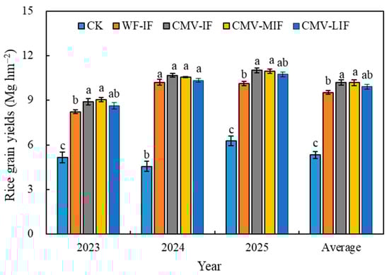 Comparisons of rice yields between treatments during the 3 years of experimental cropping. CK, winter fallow–rice rotation without both rice straw incorporation and fertilization; WF-IF, winter fallow–rice rotation with both rice straw incorporation and recommended N fertilization; CMV-IF, rice-CMV rotation with the co-incorporation of rice and CMV residues under 100% recommended N fertilization; CMV-MIF, rice-CMV rotation with the co-incorporation of rice and CMV residues under 80% recommended N fertilization; CMV-LIF, rice-CMV rotation with the co-incorporation of rice and CMV residues under 70% recommended N fertilization. Bars represent standard errors (n = 3). Means with different letters are significantly different at p < 0.05.