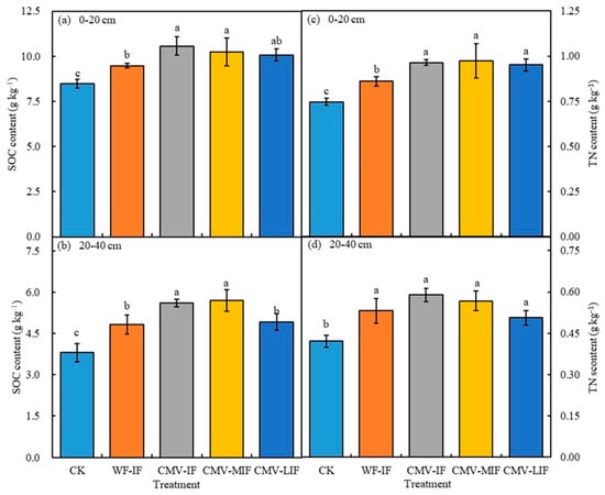 Soil organic carbon (SOC) and total nitrogen (TN) contents in the 0–20 and 20–40 cm soil layers after the rice maturity in October 2025. CK, winter fallow–rice rotation without both rice straw incorporation and fertilization; WF-IF, winter fallow–rice rotation with both rice straw incorporation and recommended N fertilization; CMV-IF, rice-CMV rotation with the co-incorporation of rice and CMV residues under 100% recommended N fertilization; CMV-MIF, rice-CMV rotation with the co-incorporation of rice and CMV residues under 80% recommended N fertilization; CMV-LIF, rice-CMV rotation with the co-incorporation of rice and CMV residues under 70% recommended N fertilization. Bars represent standard errors (n = 3). Means with different letters are significantly different at p < 0.05.