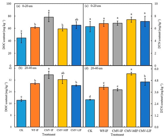 Soil dissolved organic C (DOC), dissolved total N (DTN) content in 0–20 and 20–40 cm soil layers after the rice maturity in October 2025. CK, winter fallow–rice rotation without both rice straw incorporation and fertilization; WF-IF, winter fallow–rice rotation with both rice straw incorporation and recommended N fertilization; CMV-IF, rice-CMV rotation with the co-incorporation of rice and CMV residues under 100% recommended N fertilization; CMV-MIF, rice-CMV rotation with the co-incorporation of rice and CMV residues under 80% recommended N fertilization; CMV-LIF, rice-CMV rotation with the co-incorporation of rice and CMV residues under 70% recommended N fertilization. Bars represent standard errors (n = 3). Means with different letters are significantly different at p < 0.05.