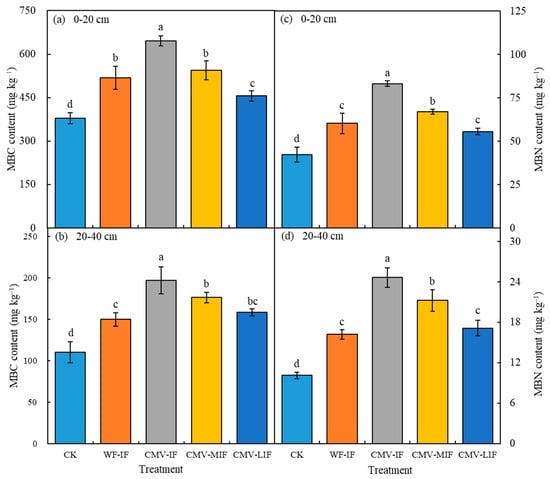 Soil microbial biomass C (MBC) and microbial biomass N (MBN) content in 0–20 and 20–40 cm soil layers after the rice maturity in October 2025. CK, winter fallow–rice rotation without both rice straw incorporation and fertilization; WF-IF, winter fallow–rice rotation with both rice straw incorporation and recommended N fertilization; CMV-IF, rice-CMV rotation with the co-incorporation of rice and CMV residues under 100% recommended N fertilization; CMV-MIF, rice-CMV rotation with the co-incorporation of rice and CMV residues under 80% recommended N fertilization; CMV-LIF, rice-CMV rotation with the co-incorporation of rice and CMV residues under 70% recommended N fertilization. Bars represent standard errors (n = 3). Means with different letters are significantly different at p < 0.05.