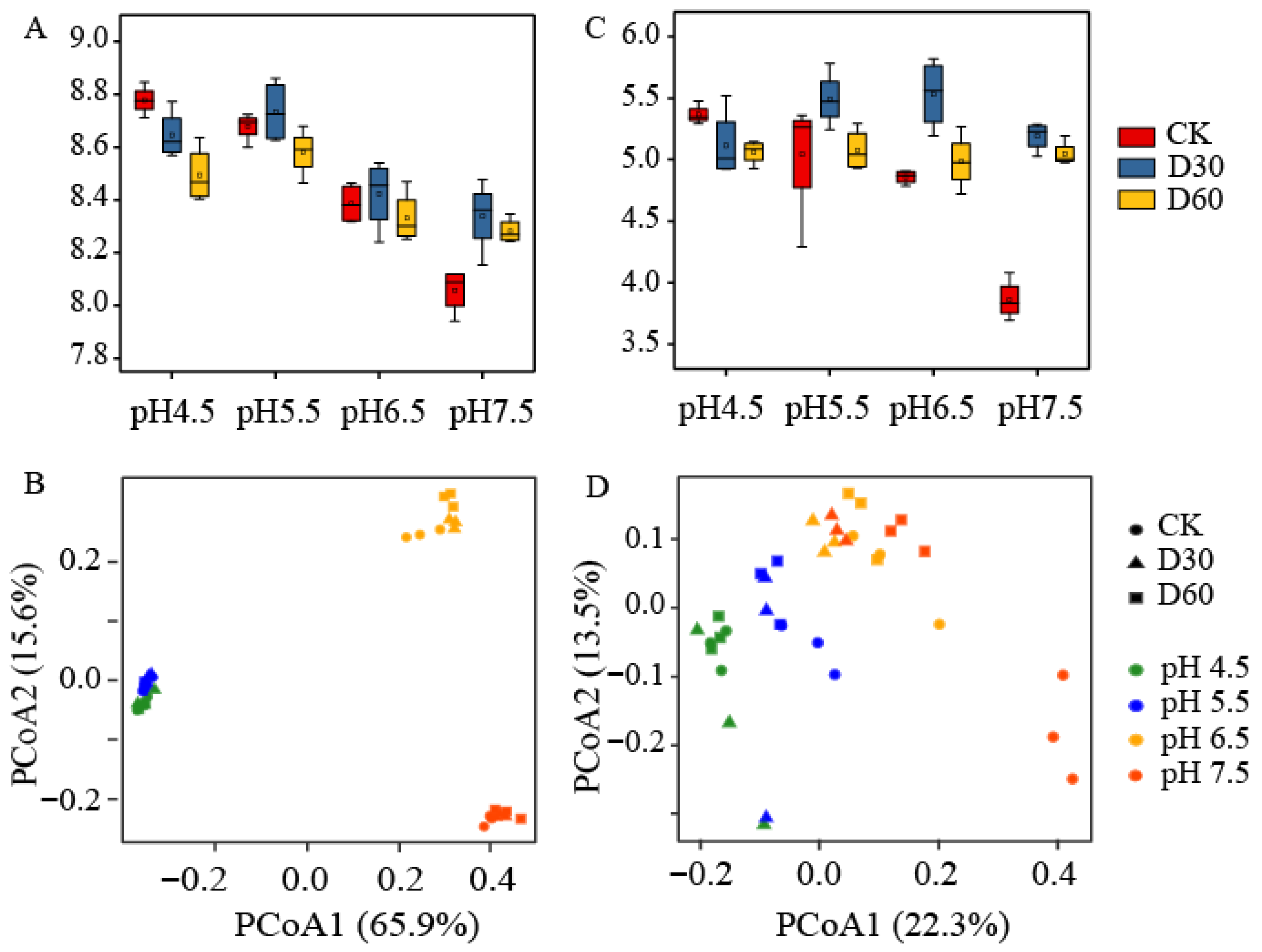 | pH 5.5 | D30 | 5.35 | 18.53 ± 1.63 bC | 52.37 ± 4.77 bB | 40.87 ± 11.56 bA | 24.56 ± 0.12 aA |