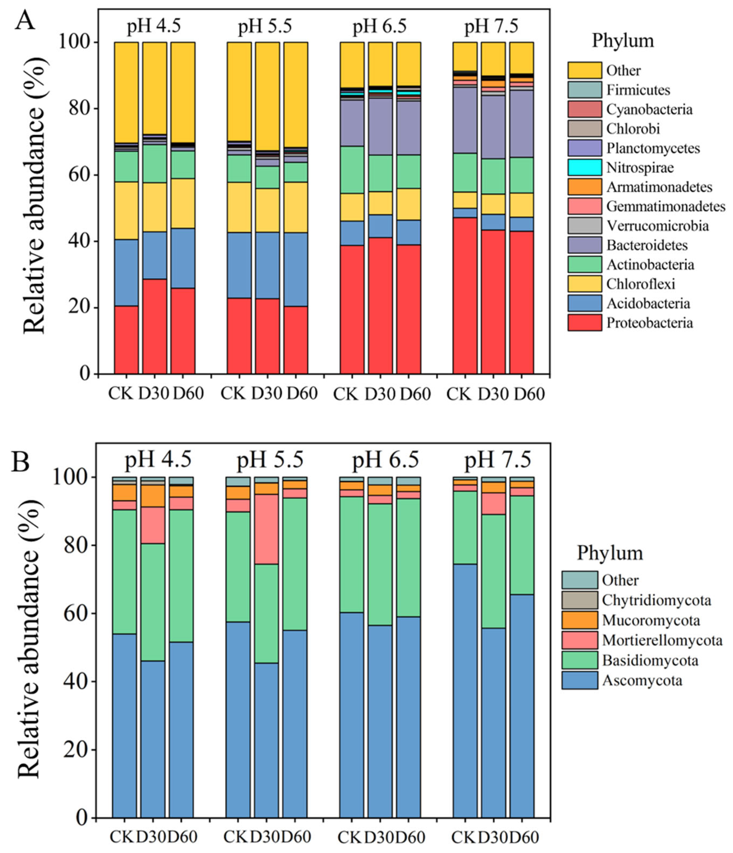 - Zhang, Y.; Dai, S.; Huang, X.; Zhao, Y.; Zhao, J.; Cheng, Y.; Cai, Z.; Zhang, J. pH-induced changes in fungal abundance and composition affects soil heterotrophic nitrification after 30 days of artificial pH manipulation. Geoderma 2020, 366, 114255. [Google Scholar] [CrossRef]