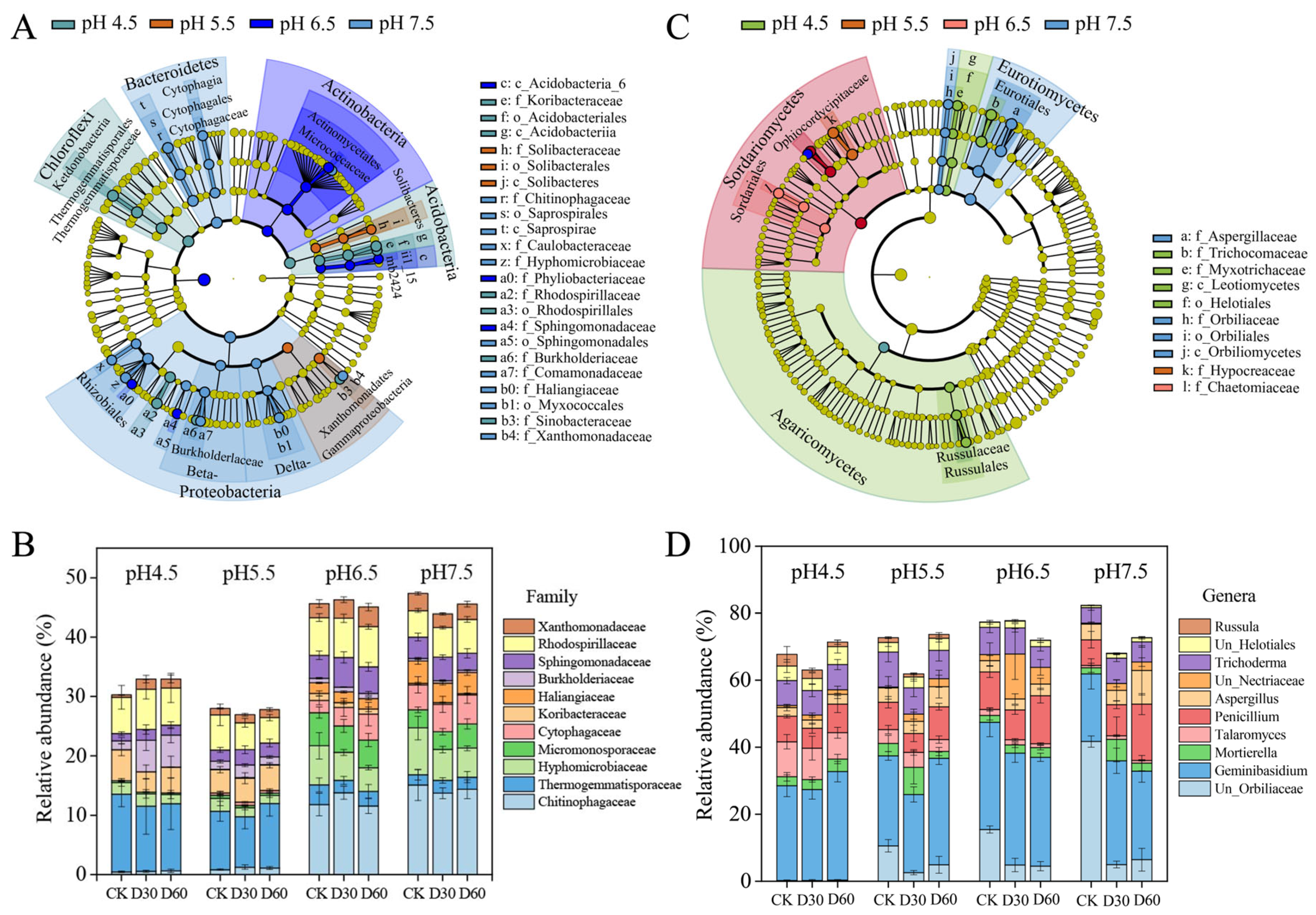 4.2. Liming Significantly Influenced the Dominant Taxa of Bacteria and Fungi