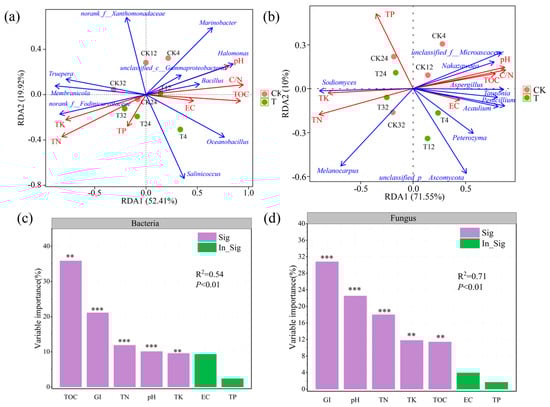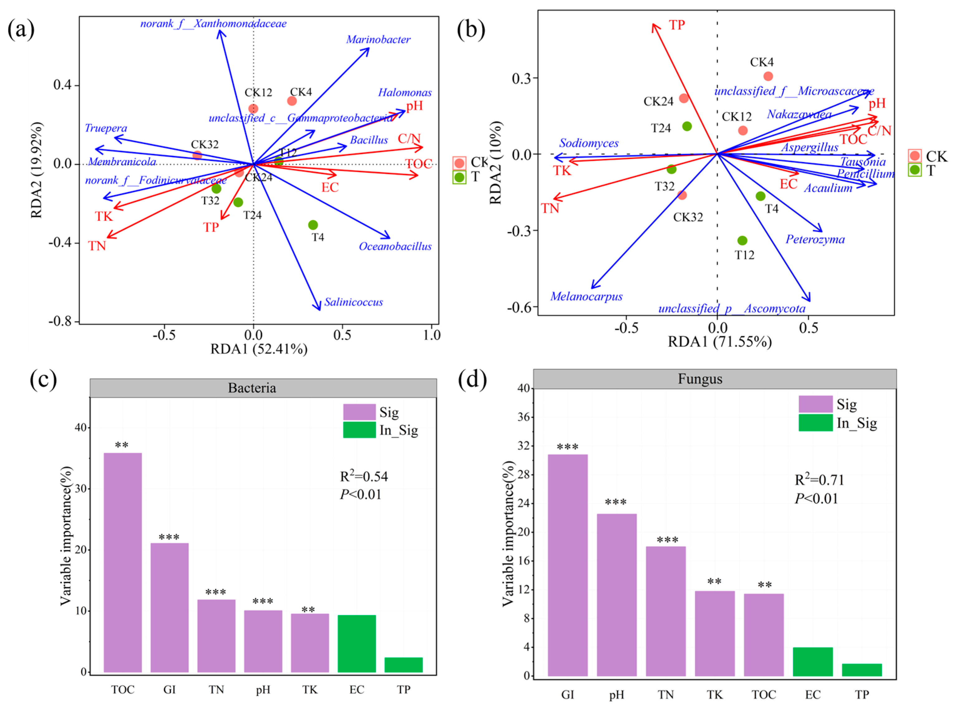 Figure 5. Redundancy Analysis (RDA) and Hierarchical Partitioning plots: (a) RDA of bacterial communities and environmental factors; (b) RDA of fungal communities and environmental factors; (c) hierarchical partitioning of bacterial communities with environmental factors; (d) hierarchical partitioning of fungal communities with environmental factors. Asterisks denote statistical significance levels: ** p < 0.01, *** p < 0.001. CK—without microbial inoculation; T—added cellulose—degrading microbial inoculants.
