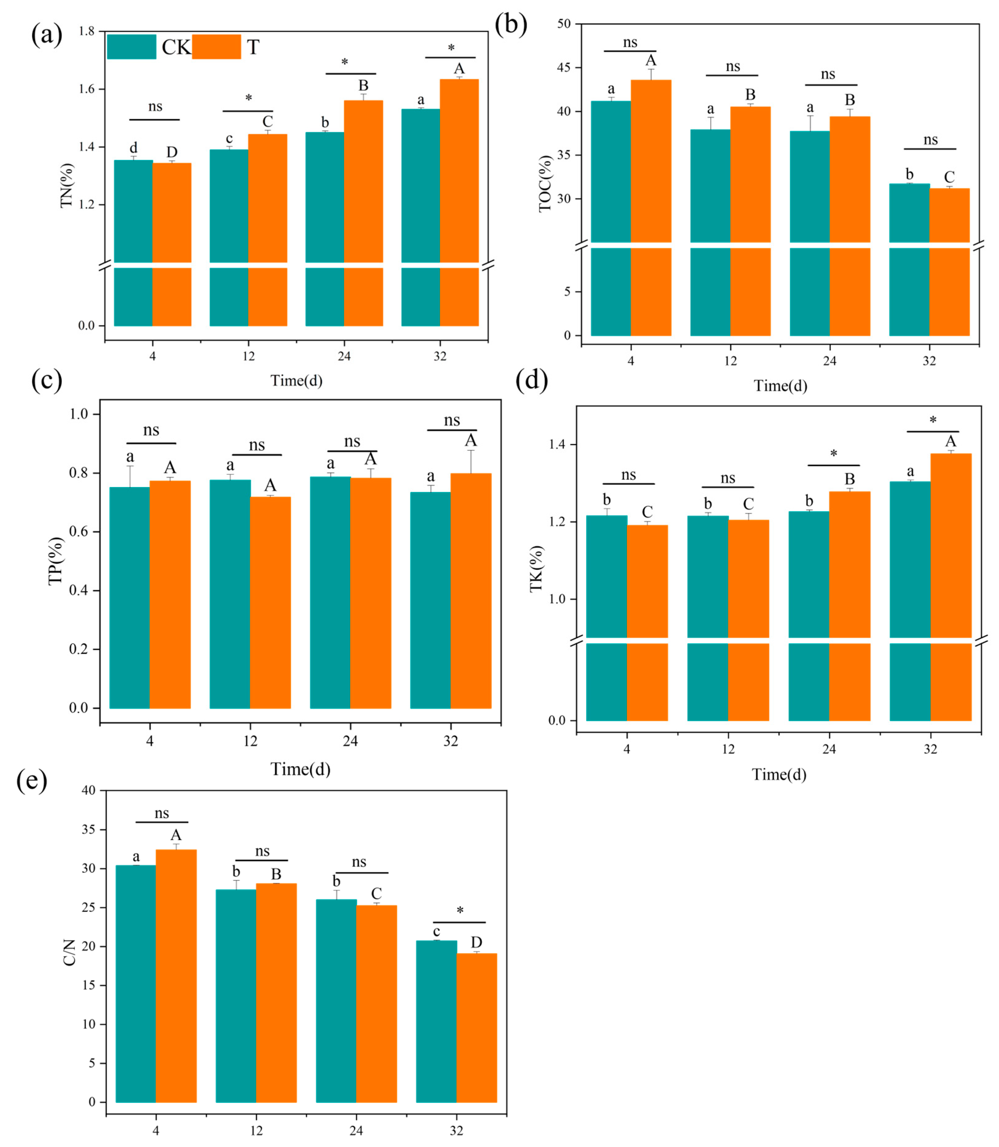 Figure 2. The character of TN (a), TOC (b), TP (c), TK (d), and C/N (e) during composting. Different lowercase letters (a–d) indicate significant differences within the same treatment across composting time (p < 0.05). Different uppercase letters indicate significant differences within the same treatment across composting time (p < 0.05). Differences between CK and T at the same sampling time are indicated by * (p < 0.05), while ns indicates no significant difference. TN: Total nitrogen; TOC: Total organic carbon; TP: Total phosphorus; TK: Total potassium; C/N: Carbon–Nitrogen ratio. CK—without microbial inoculation; T—added cellulose-degrading microbial inoculants.