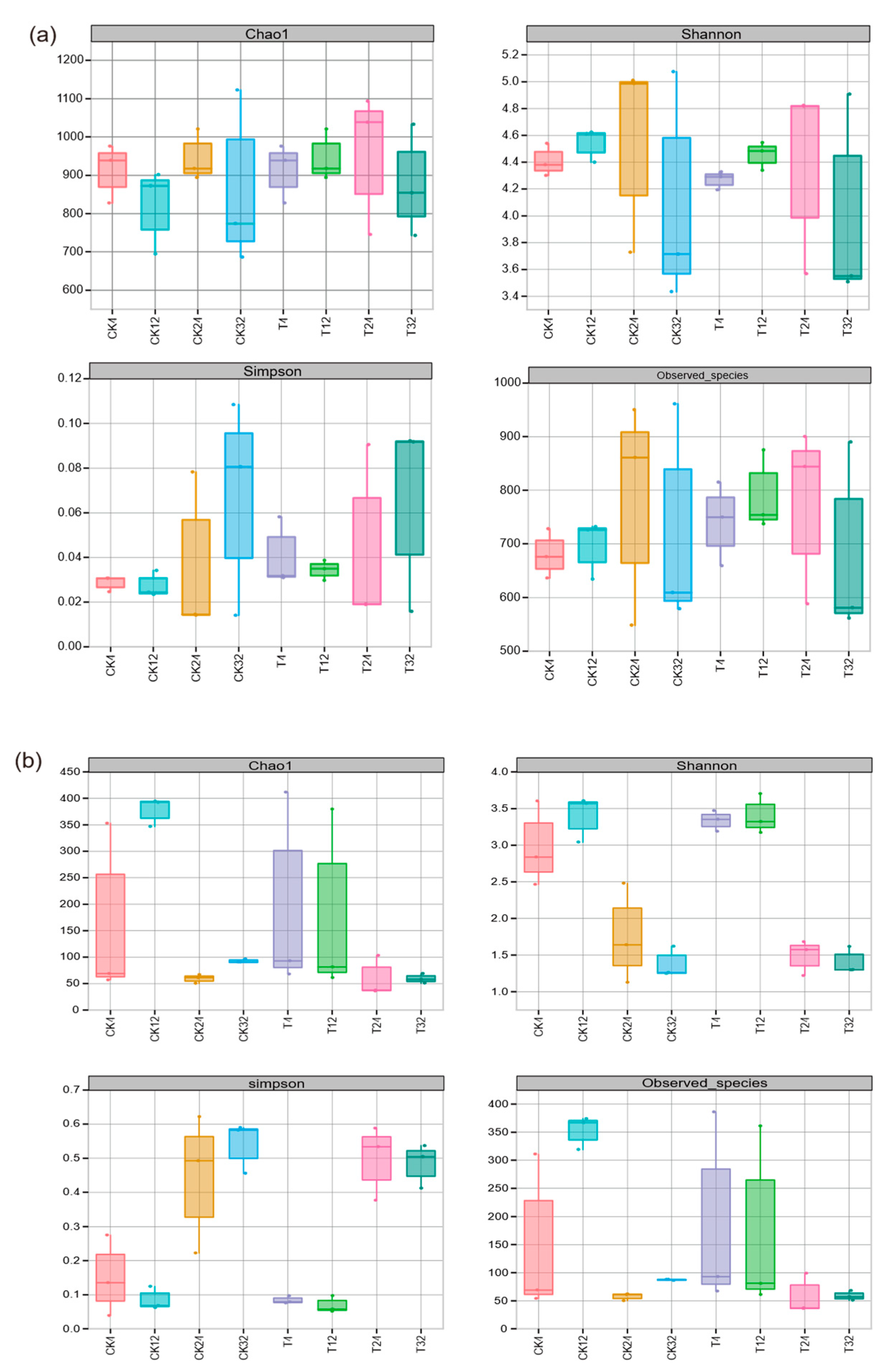 Figure 3. The (a) bacterial alpha diversity and (b) fungal alpha diversity in two different composts. CK—without microbial inoculation; T—added cellulose-degrading microbial inoculants.