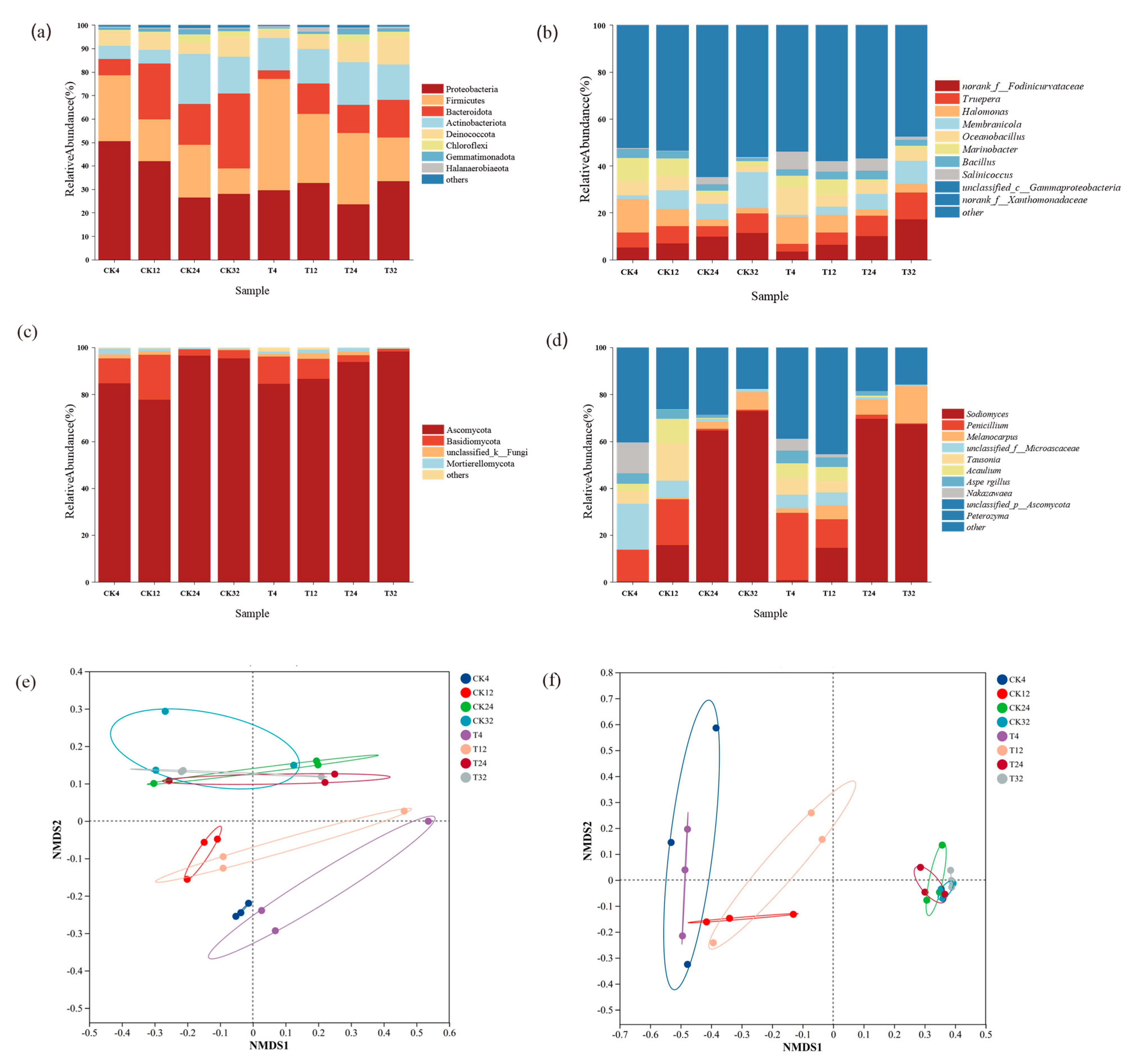 Figure 4. The bacterial community at (a) phylum and (b) genus levels (top 10). The fungal community at (c) phylum and (d) genus levels (top 10). The microbial beta diversity indexes and community structures in two different composts. Nonmetric Multidimensional Scaling (NMDS) analysis of (e) bacteria and (f) fungi. CK—without microbial inoculation; T—added cellulose-degrading microbial inoculants.