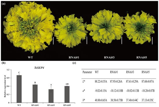 Characterization of phenotypes in RNAi-TeSEP4 marigold. (a) Characterization of phenotypic changes in RNAi-TeSEP4 transgenic marigold lines. Bar = 1 cm. (b) Comparative TeSEP4 expression in RNAi-TeSEP4 transgenic and wild-type marigold. (c) Comparative assessment of petal color coefficients between RNAi-TeSEP4 transgenic lines and wild-type marigolds. WT: wild-type plants, RNAi#1: RNAi-TeSEP4#1, RNAi#3: RNAi-TeSEP4#3, and RNAi#5: RNAi-TeSEP4#5. Values are expressed as means ± SD (n = 4). Capital letters denote statistically significant differences (p < 0.01), as assigned based on one-way ANOVA performed with IBM SPSS Statistics 26.