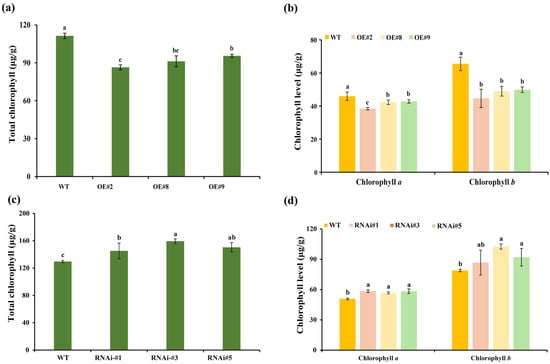 Chlorophyll concentrations in the florets of transgenic lines and wild-type plants. (a) The total chlorophyll level in TeSEP4-overexpression transgenic plants. (b) The chlorophyll a and chlorophyll b levels in TeSEP4-overexpression transgenic plants. (c) The total chlorophyll level in RNAi-TeSEP4 transgenic plants. (d) The chlorophyll a and chlorophyll b content in RNAi-TeSEP4 transgenic plants. OE#2: OE-TeSEP4#2, OE#8: OE-TeSEP4#8, OE#9: OE-TeSEP4#9, RNAi#1: RNAi-TeSEP4#1, RNAi#3: RNAi-TeSEP4#3, and RNAi#5: RNAi-TeSEP4#5. Data are shown as means ± SD (n = 3). Lowercase letters denote significant differences based on one-way ANOVA (p < 0.05).