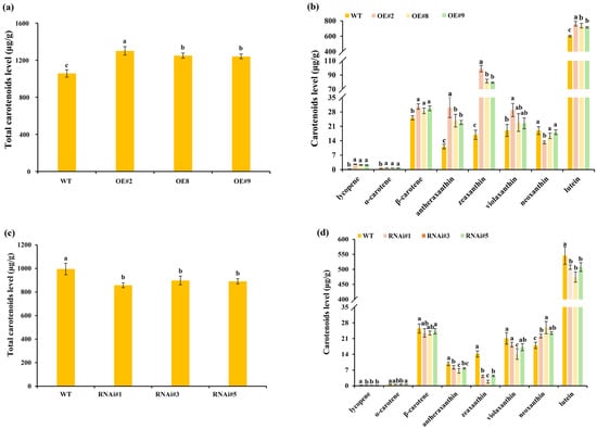 To elucidate the metabolic mechanisms underlying the petal color changes in transgenic plants, the chlorophyll and carotenoid profiles of wild-type plants and transgenic lines (OE#2, OE#5, OE#9, RNAi#1, RNAi#3, and RNAi#5) were compared (Figure 4 and Figure 5).