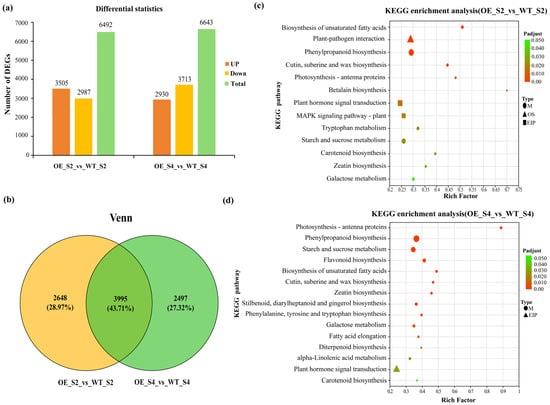 Identification of DEGs in OE_S2_vs_WT_S2 and OE_S4_vs_WT_S4. (a) Statistics of up-regulated and down-regulated DEGs. (b) Venn diagram of DEGs in OE_S2_vs_WT_S2 and OE_S4_vs_WT_S4. KEGG enrichment of DEGs in OE_S2_vs_WT_S2 (c) and OE_S4_vs_WT_S4 (d).