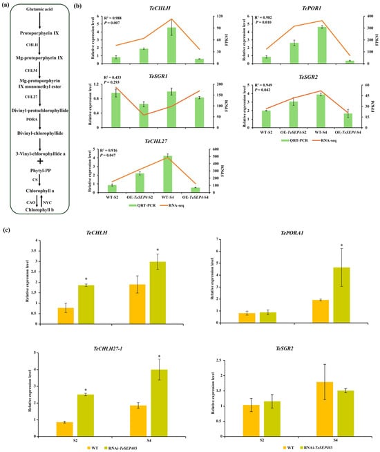 Expression profiling of chlorophyll biosynthesis-related DEGs in transgenic lines and wild-type plants. (a) Biosynthetic pathways of chlorophyll. (b) Validation of the RNA-seq results was performed using qRT-PCR. Data are expressed as means ± SD of three biological replicates, each comprising three technical replicates. (c) Analysis of TeCHLH, Te-PORA1, TeCHL27-1, and TeSGR2 expression levels in RNAi-TeSEP4#3 by qRT-PCR. WT: wild-type plants. Data correspond to the mean ± SD derived from three biological and three technical replicates. Asterisks indicate statistically significant differences based on Student’s t-test.