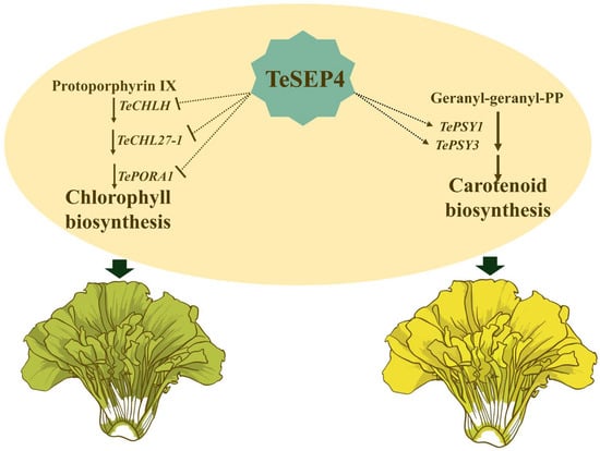 Proposed potential working model of TeSEP4 in regulating chlorophyll and carotenoid biosynthesis. TeSEP4 concurrently regulates both pathways by repressing the transcription of TeCHLH, TeCHL27-1, and TePORA1, while promoting that of TePSY1 and TePSY3. The green arrows indicate that reduced chlorophyll synthesis and increased carotenoid synthesis lead to the formation of green and yellow petals, respectively. The putative direct regulation by TeSEP4 (dashed lines) awaits validation in future studies.