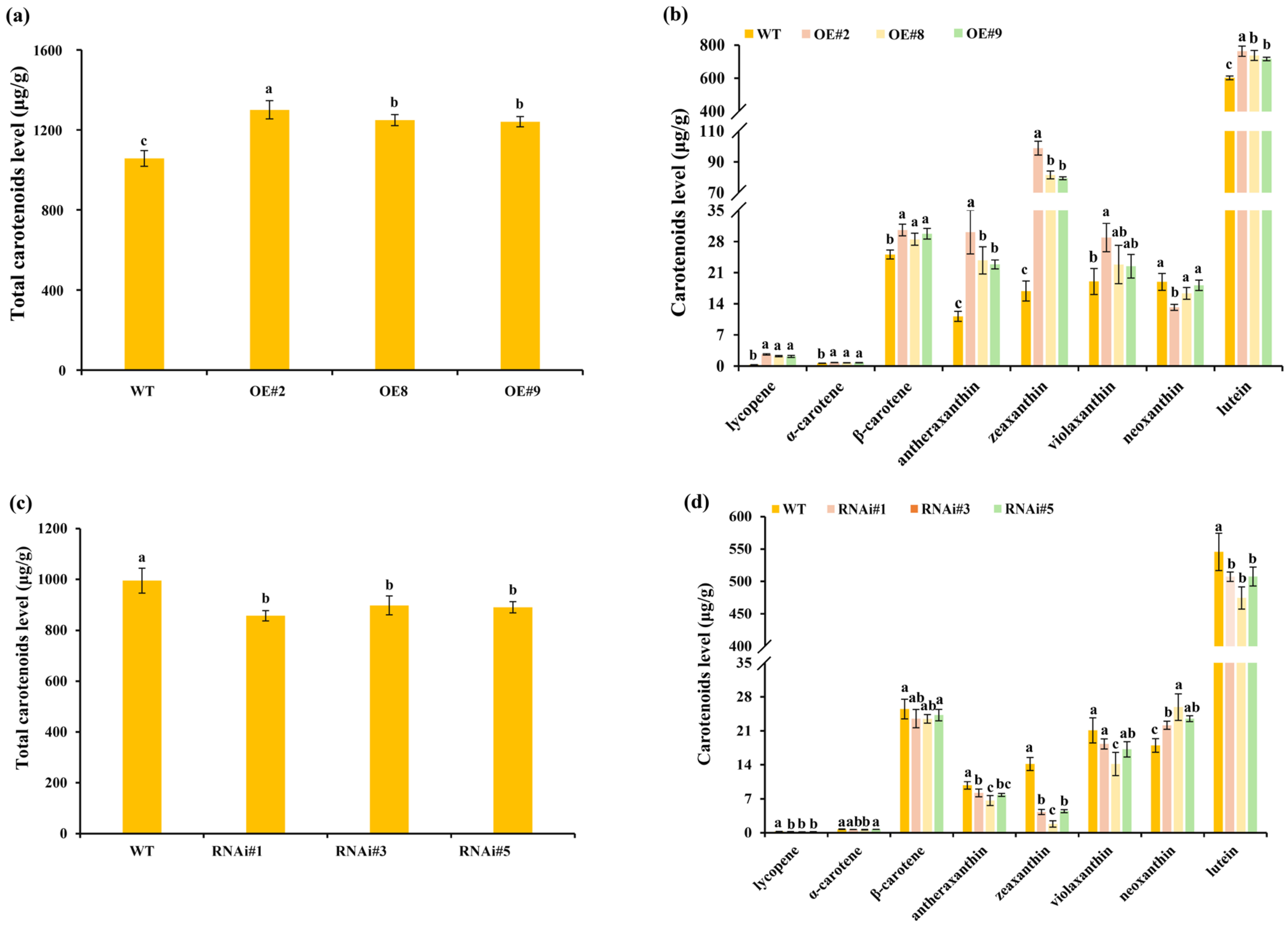- Qiu, Y.; Wang, R.; Zhang, E.; Shang, Y.; Feng, G.; Wang, W.; Ma, Y.; Bai, W.; Zhang, W.; Xu, Z. Carotenoid biosynthesis profiling unveils the variance of flower coloration in Tagetes erecta and enhances fruit pigmentation in tomato. Plant Sci. 2024, 347, 112207. [Google Scholar] [CrossRef] [PubMed]