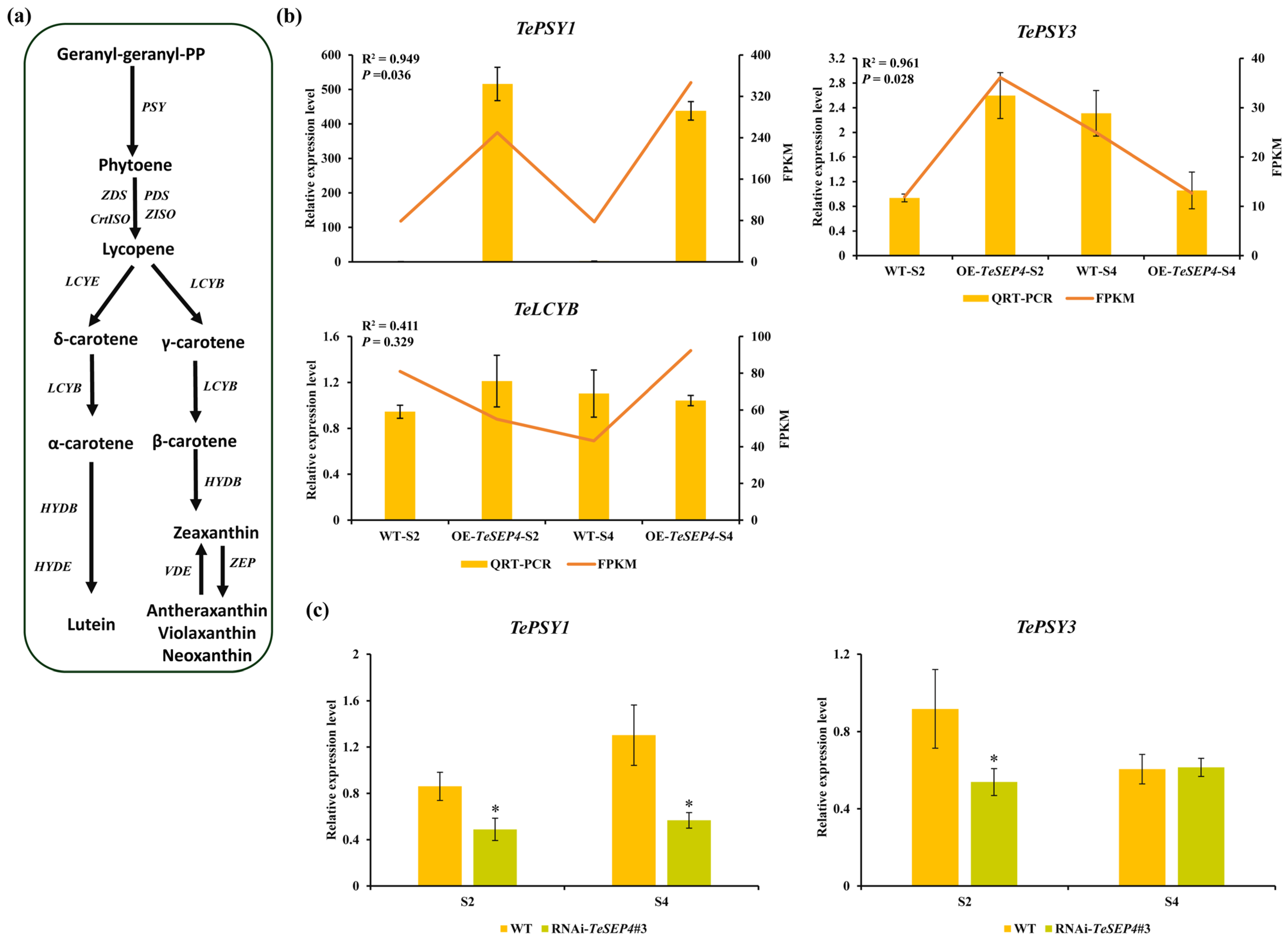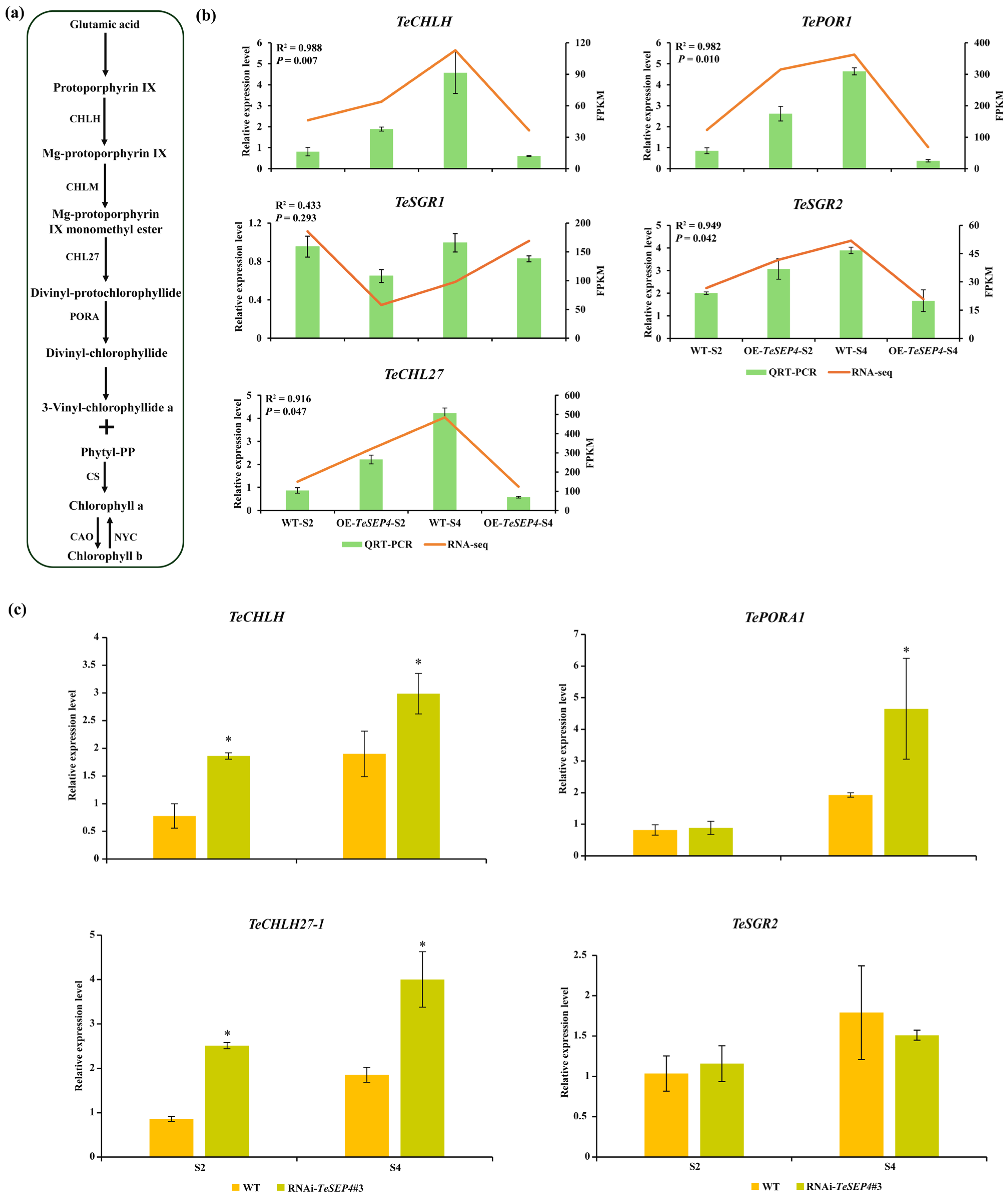 4.2. TeSEP4 Might Be a Key TF Coordinating Chlorophyll and Carotenoid Biosynthesis