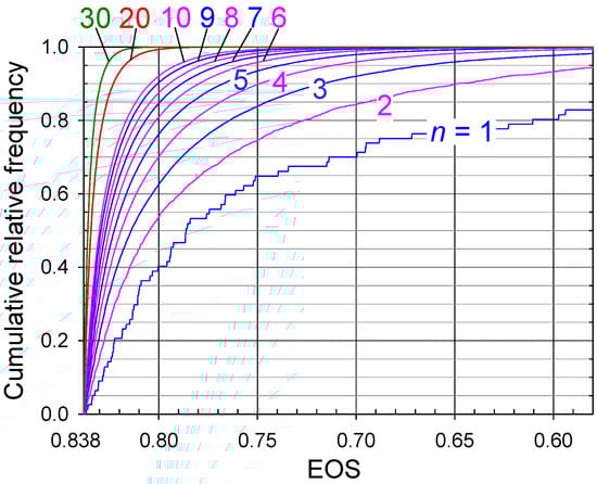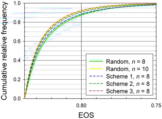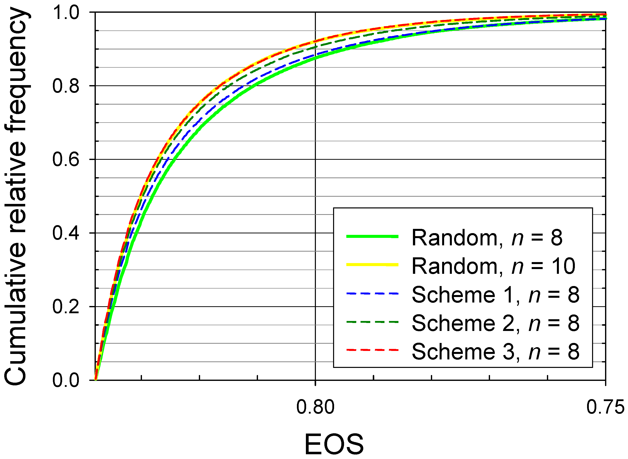 Here, RSSIF represents the residual error when the spatial variability is most accurately expressed under the conditions in which the LN model is assumed. In contrast, RSSUF represents the error when the spatial variability in the pore-size distribution is not considered. Thus, EOS evaluates the effect of each scaling method by considering the possible range of RSS derived from the proposed scaling method. When the scaling method perfectly explains the spatial variation under the conditions in which the LN model is assumed, EOS is equal to one. In contrast, when the scaling method cannot explain spatial variability, EOS is equal to zero.