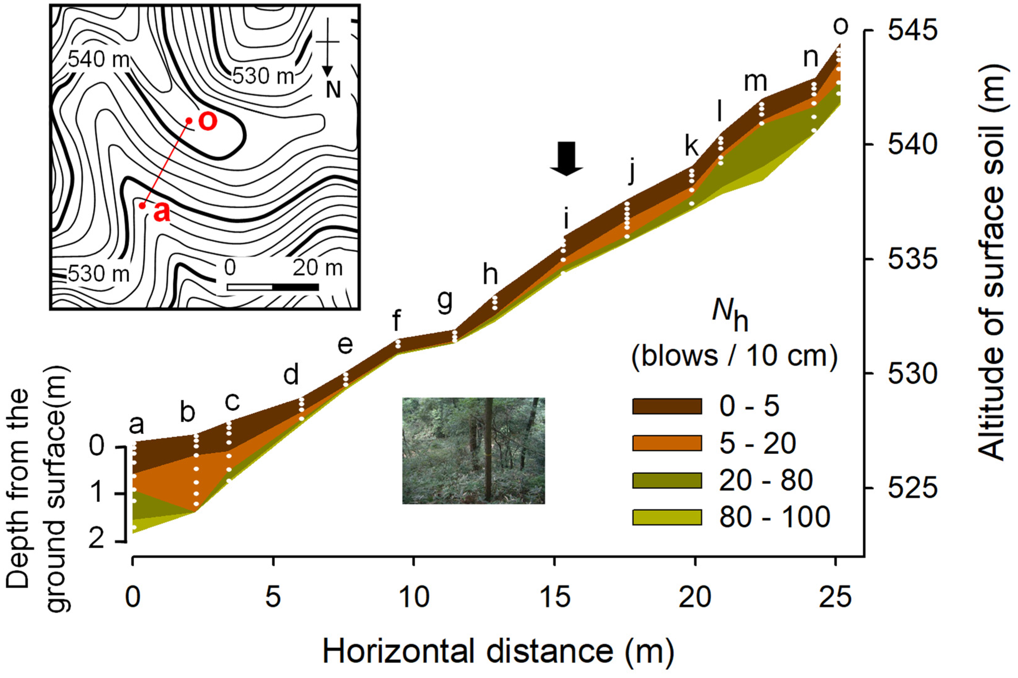 Figure 1) on the soil surface of the middle slope. There were slope regions with a thin soil layer below this dip and a thick soil layer above this dip. Thus, the dip may correspond to the head of an ancient landslide, and it was presumed that the thick soil layer consisted of debris brought by the landslide from the middle slope region. This was also supported by the vertical distribution of penetration resistance,
