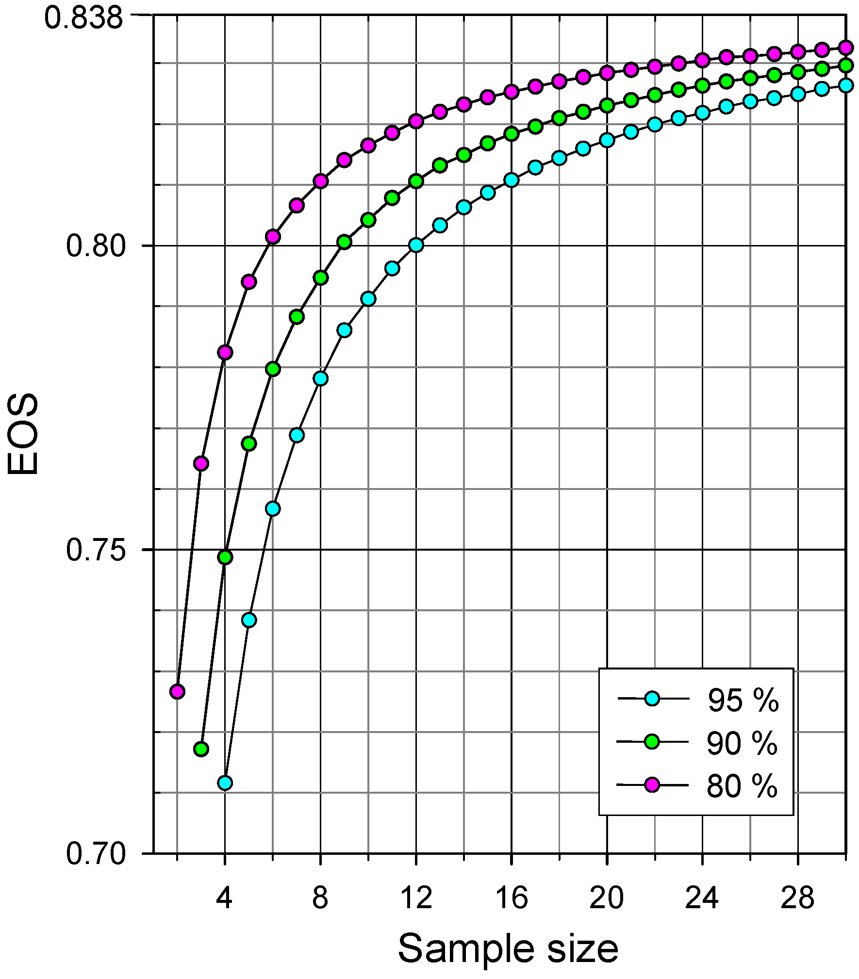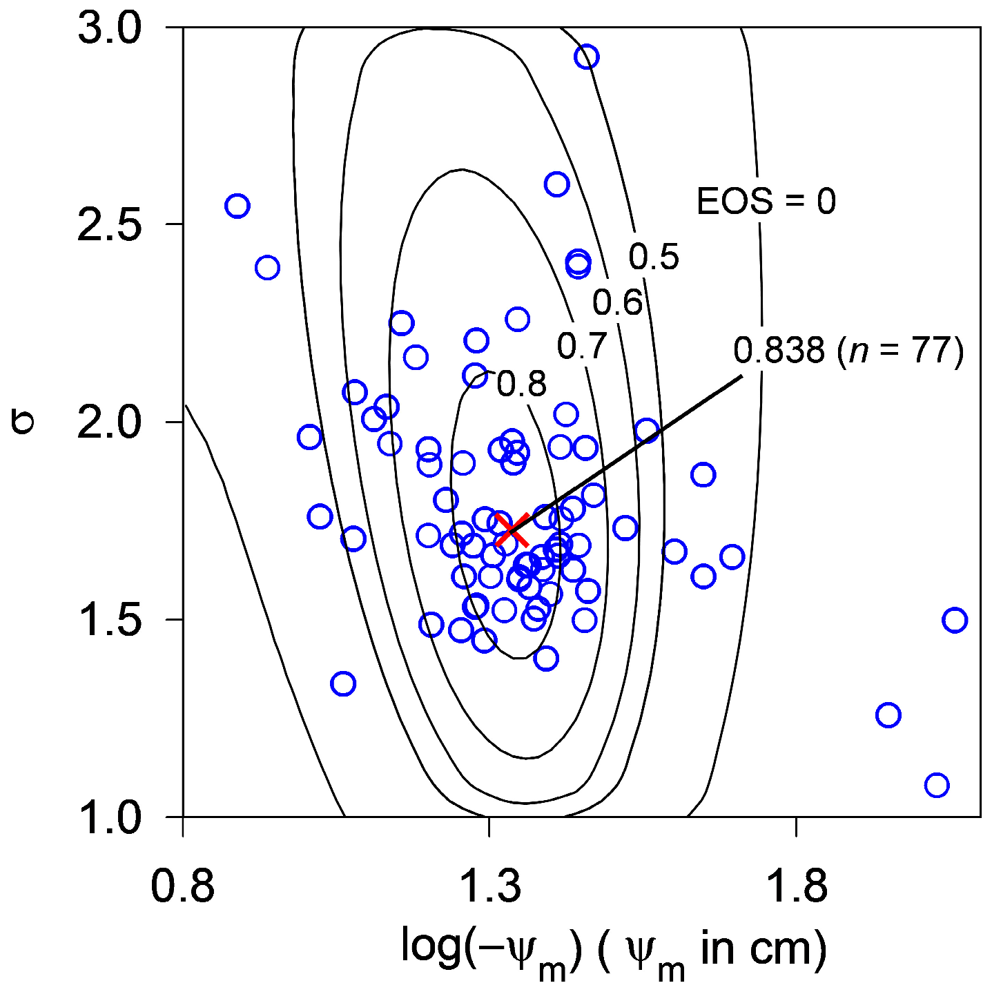 EOS was greater. The effect of scaling increased with increasing sample size. Its rate of increase decreased and became about 0 at a sample size of approximately 20. In total, 78% of the spatial variability of the WRCs was explained at a 95% confidence level by using the reference parameters derived from eight samples.