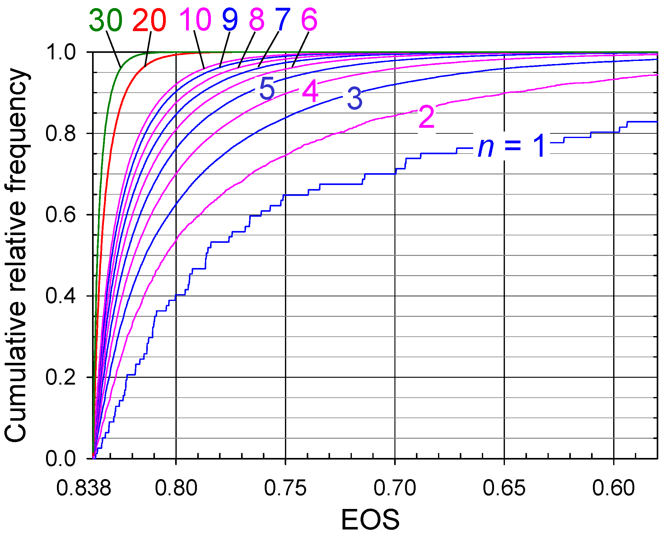 EOS calculated from the whole 77 data sets of reference parameters was plotted at the center of the figure. In addition, as the sample number of WRCs required to determine reference parameters was larger, the probability of deriving the highest