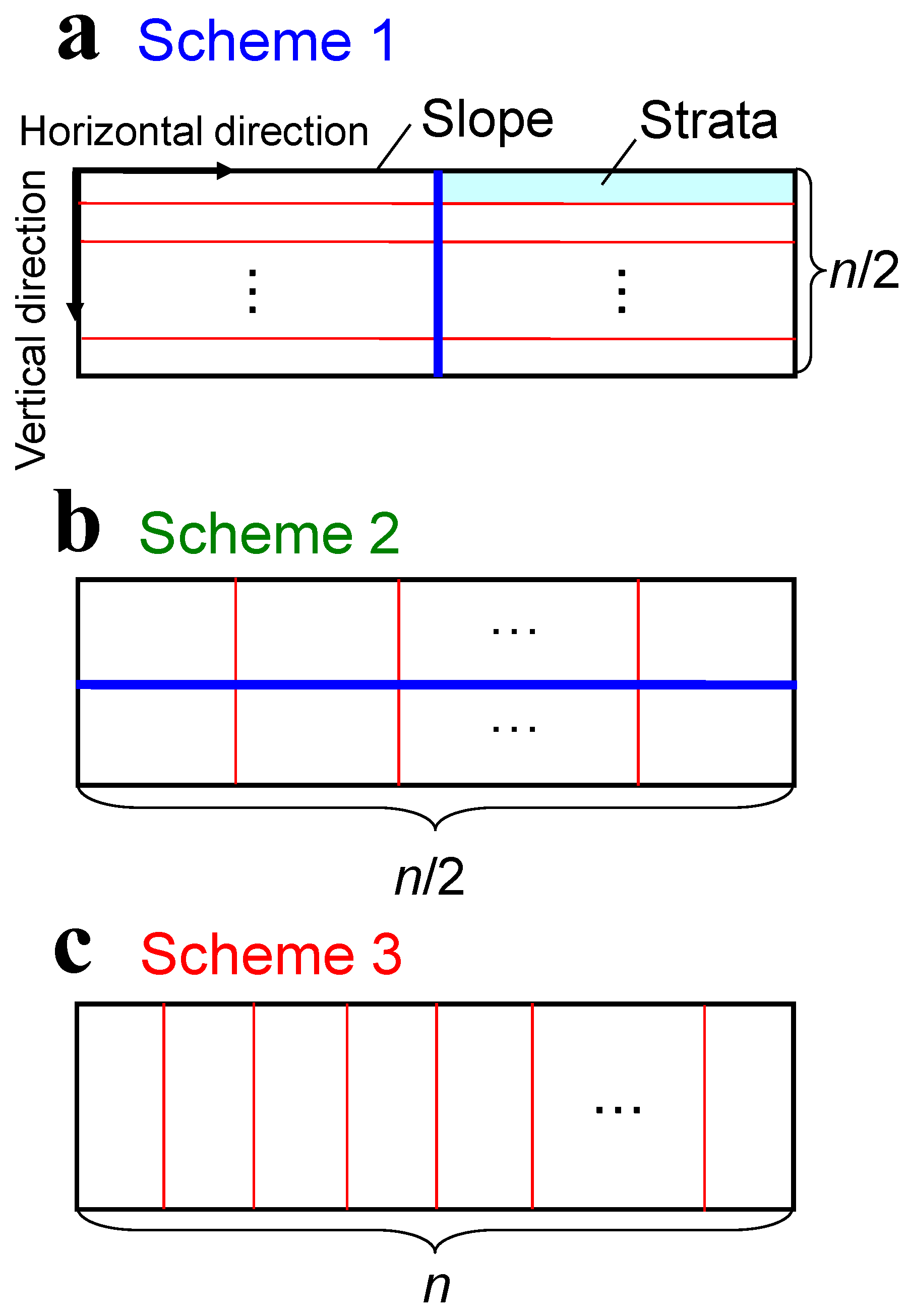 Stratified sampling was performed to reduce the number of WRCs required with a high EOS. Three sampling schemes were tested by considering the different spatial patterns to investigate the effective stratified sampling. The sampling scheme that considered the variability in the slope direction but not in the vertical direction was the most advantageous. The reference parameters derived from eight samples using this scheme performed the accuracy of ten samples derived from complete random sampling.