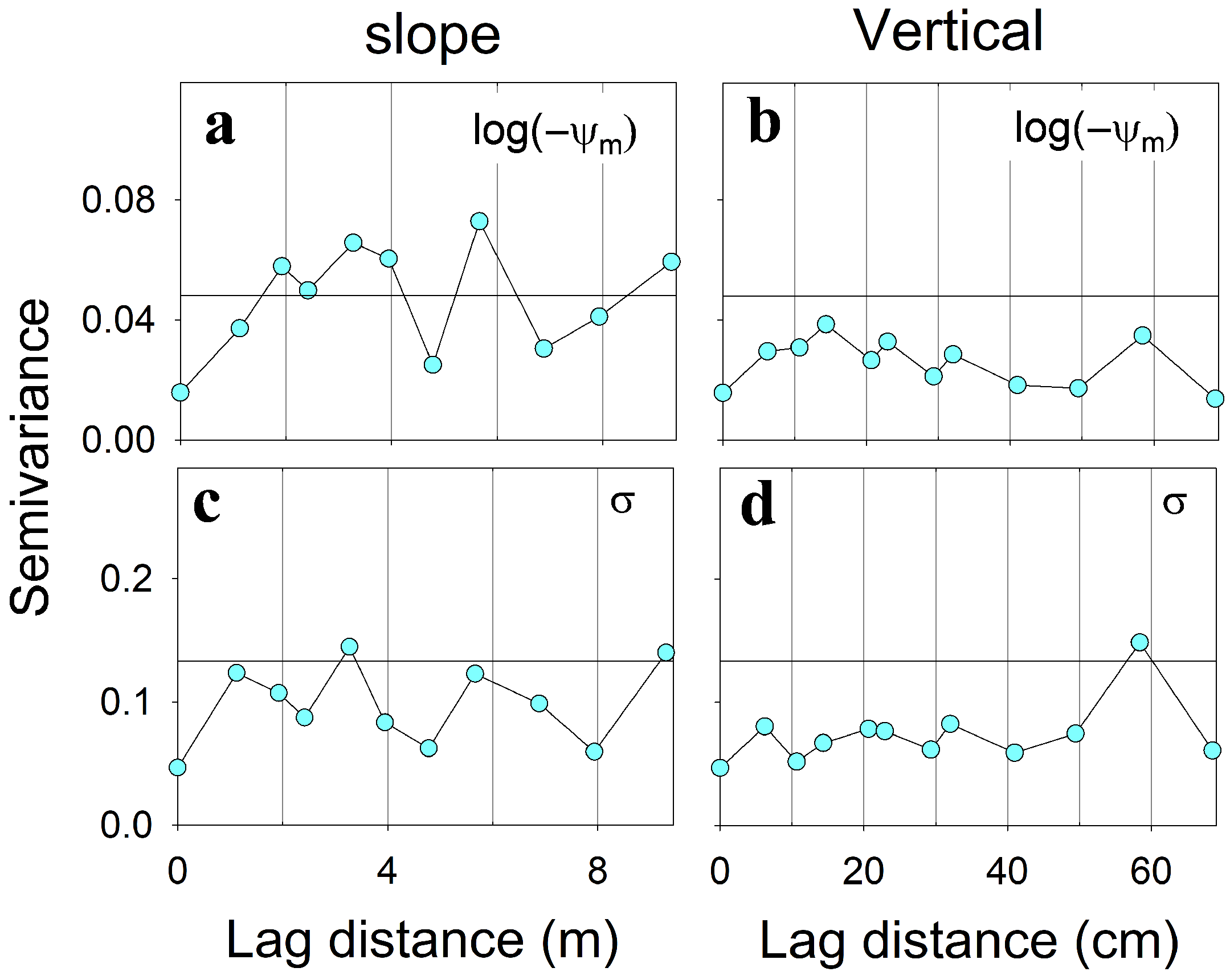 We analyzed the spatial distribution of reference parameters using a semivariogram. The definition of semivariogram goes back to Matheron. The experimental semivariograms of log(−ψ