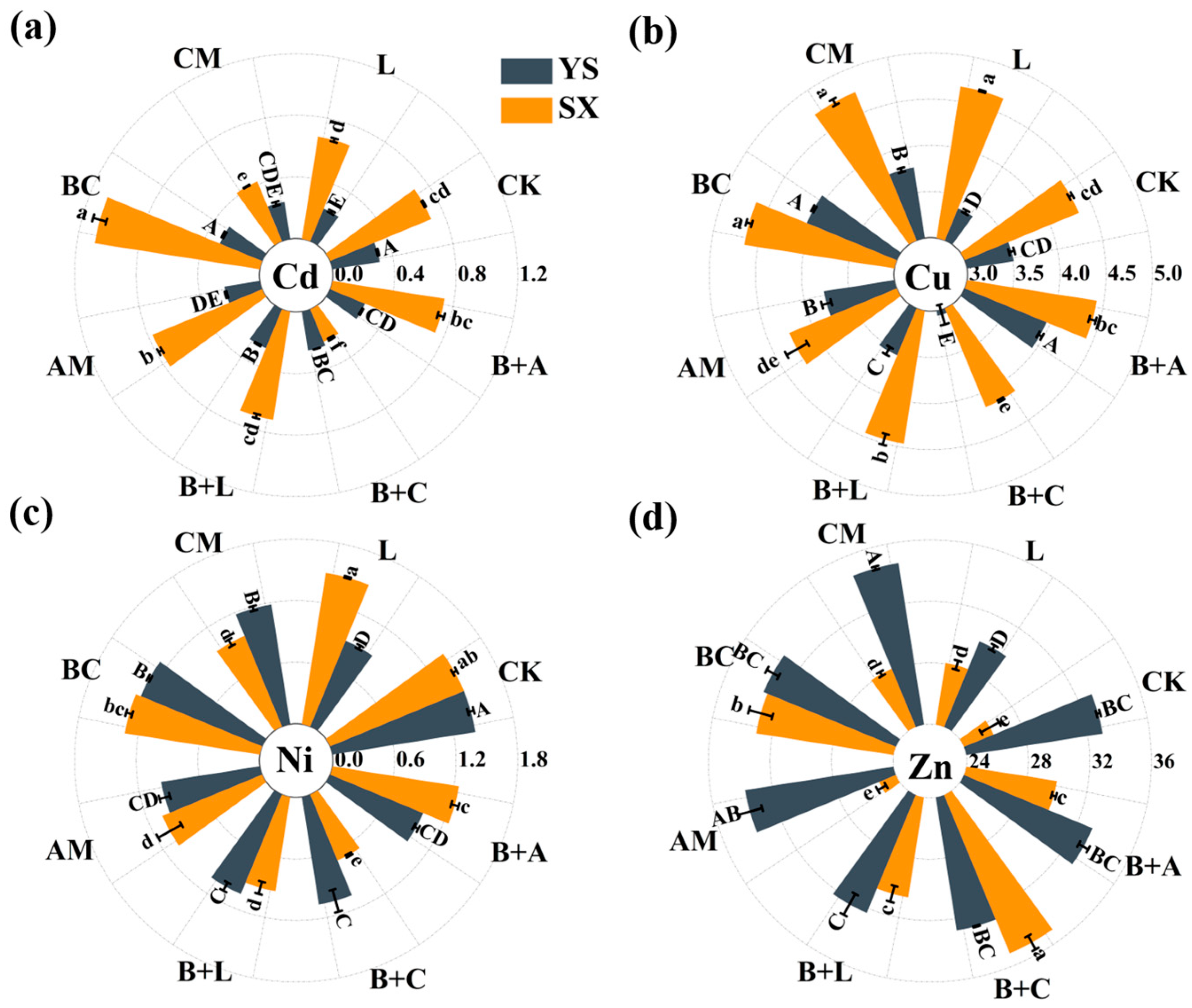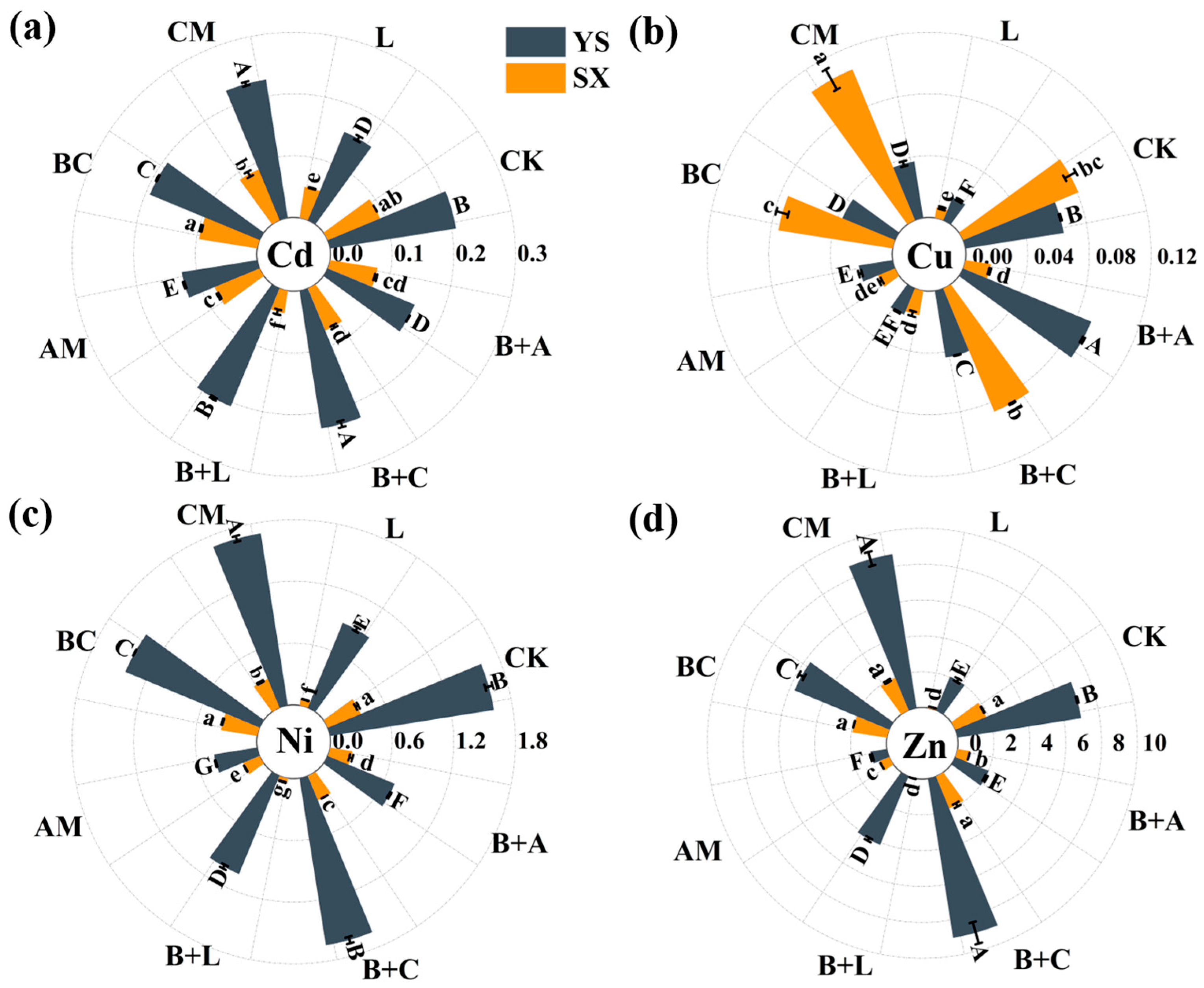 3.3. Effects of Amendments on Soil Bioavailable Cd, Cu, Ni, and Zn