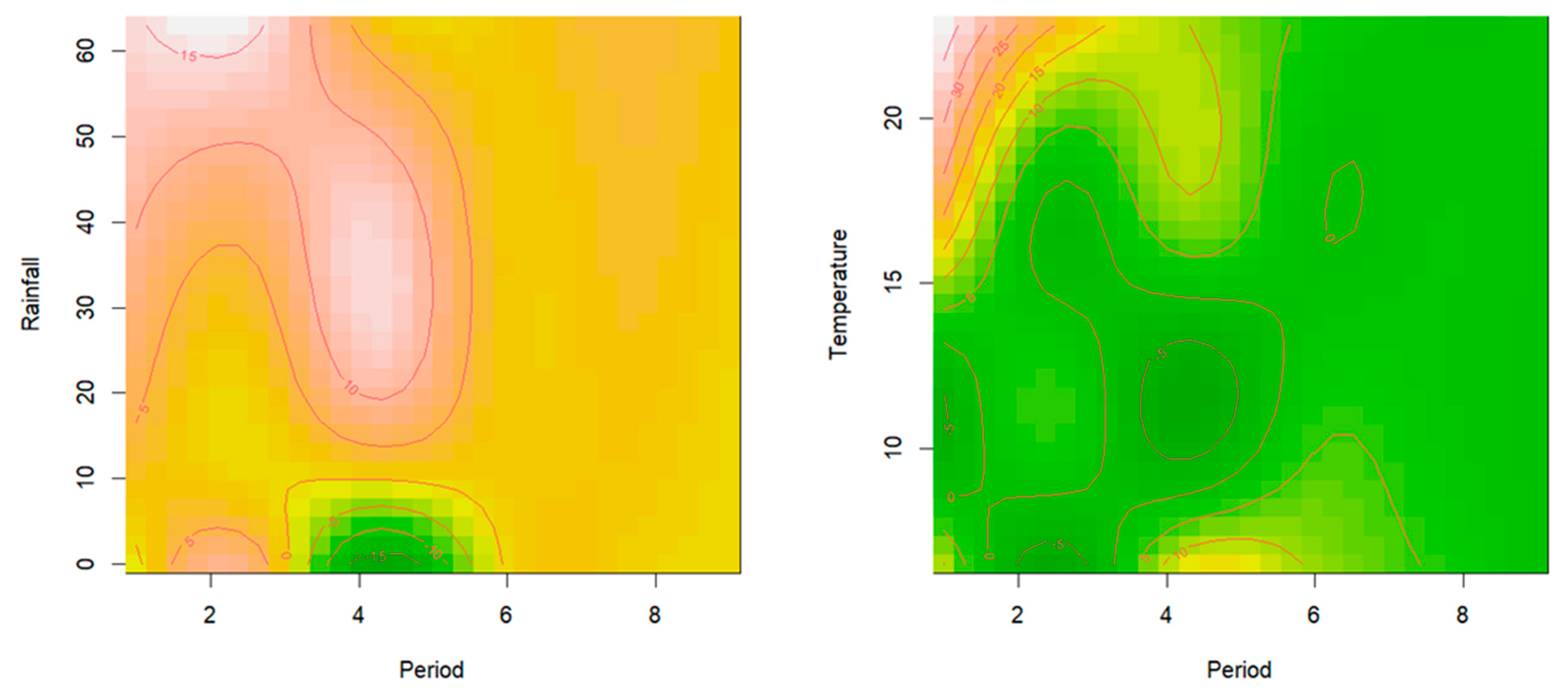 | Smooth | Period, Rainfall | edf = 11.7 | F = 11.6 | *** |