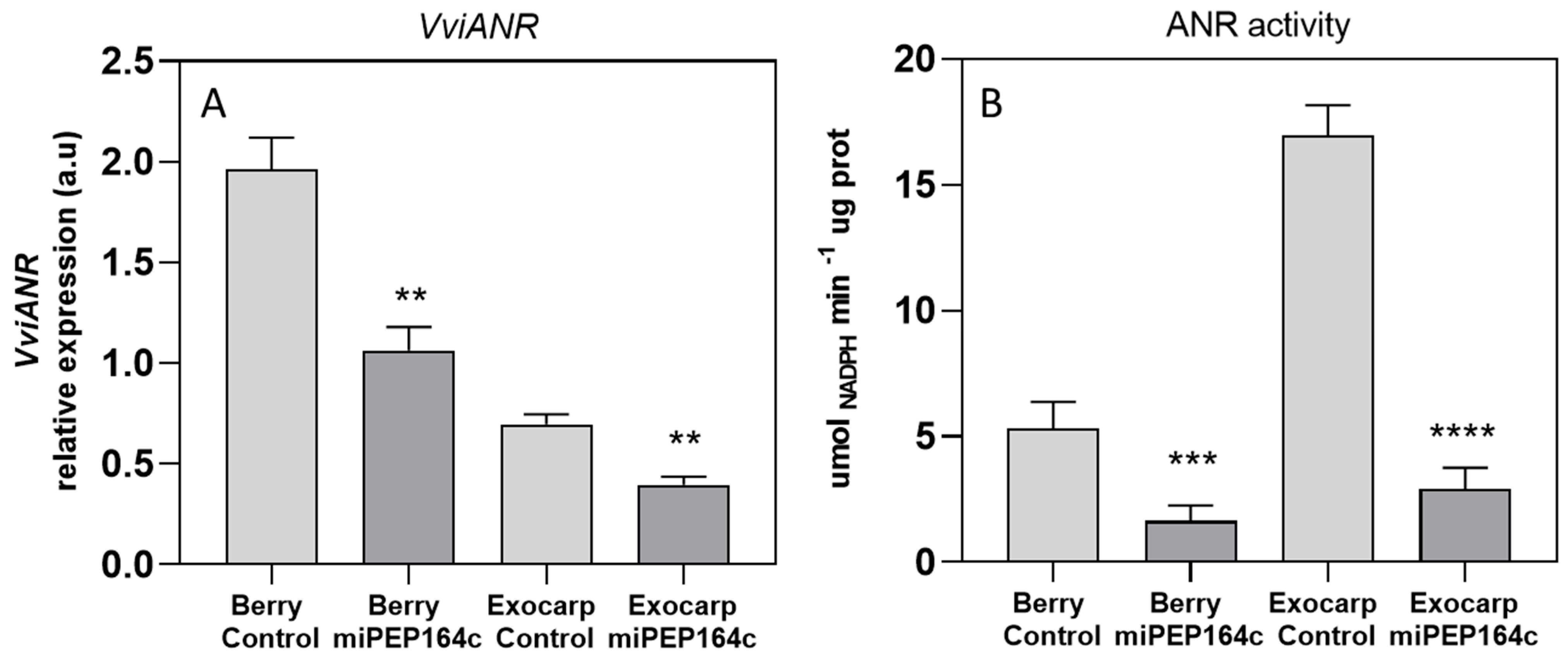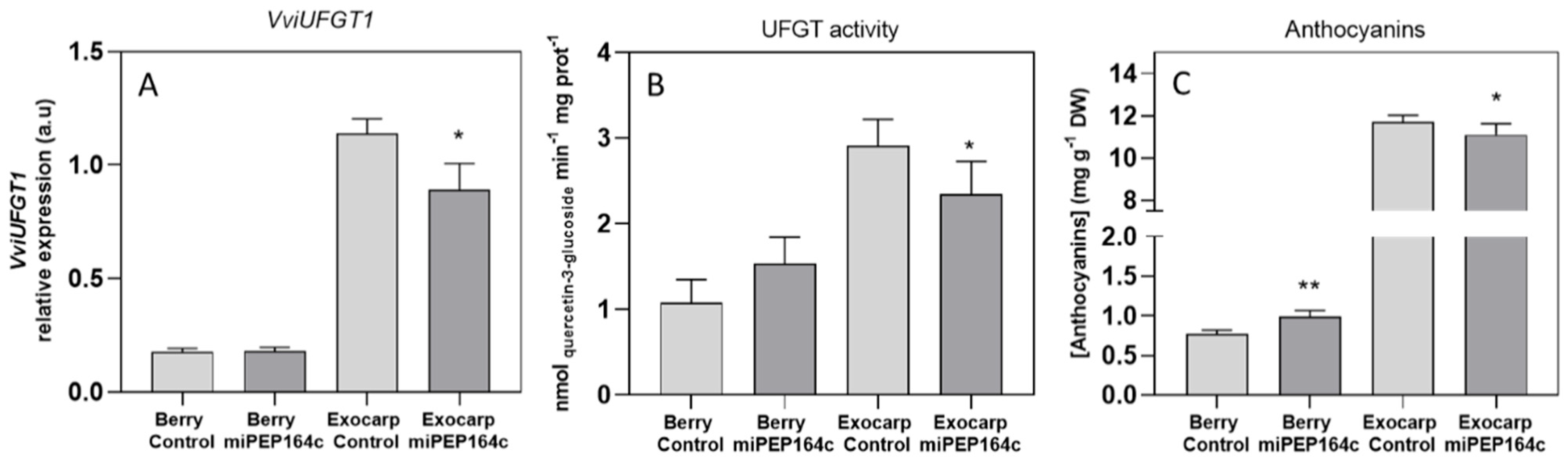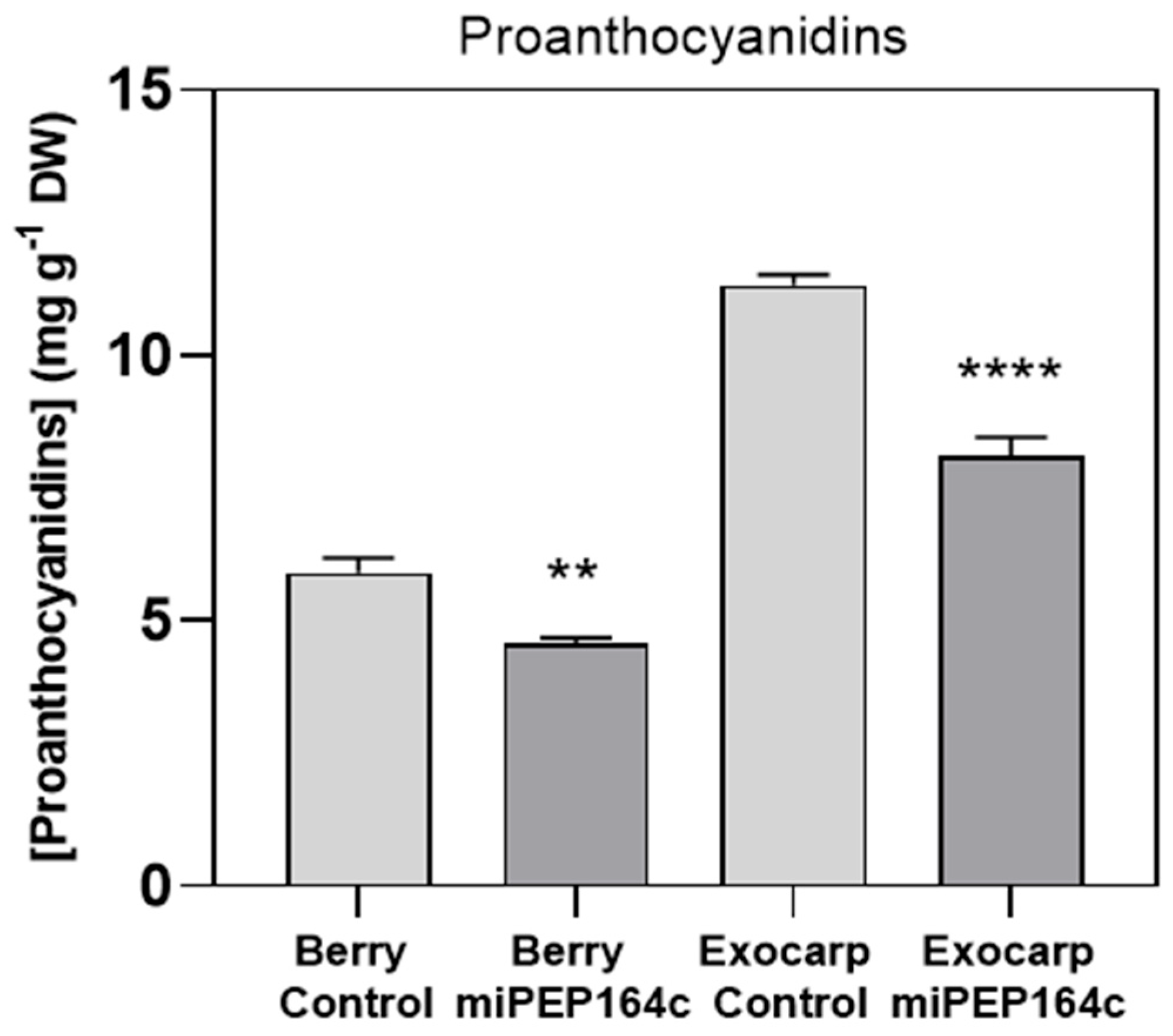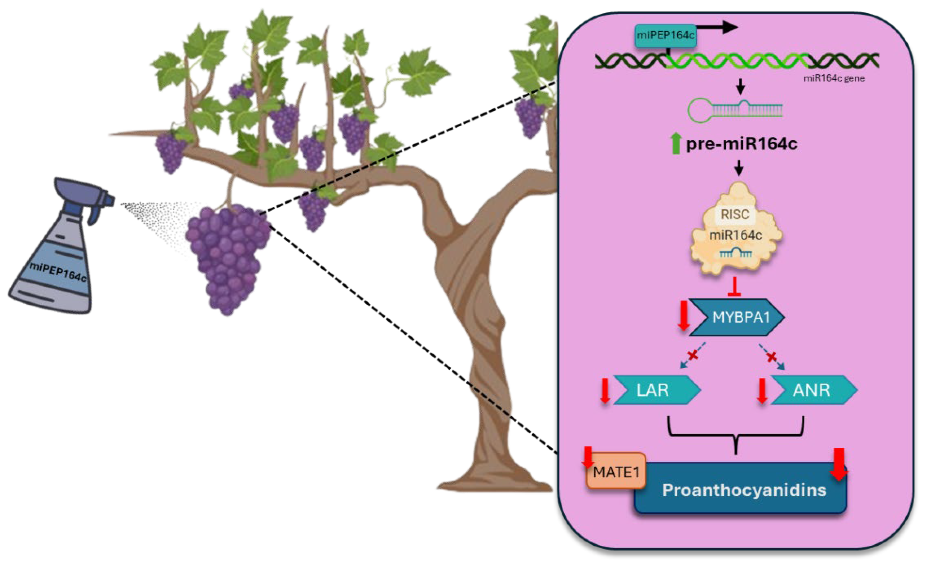 - Vale, M.; Rodrigues, J.; Badim, H.; Gerós, H.; Conde, A. Exogenous Application of Non-mature miRNA-Encoded miPEP164c Inhibits Proanthocyanidin Synthesis and Stimulates Anthocyanin Accumulation in Grape Berry Cells. Front. Plant Sci. 2021, 12, 706679. [Google Scholar] [CrossRef] [PubMed]