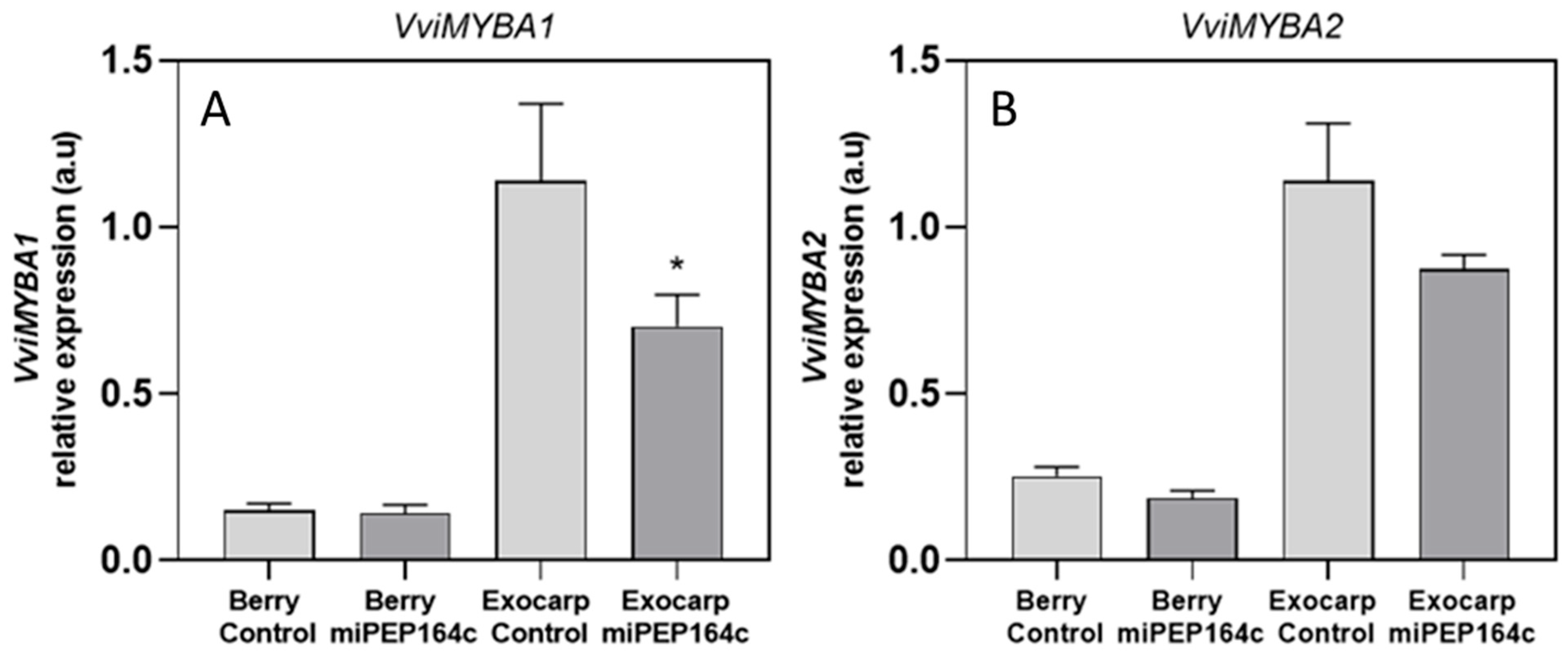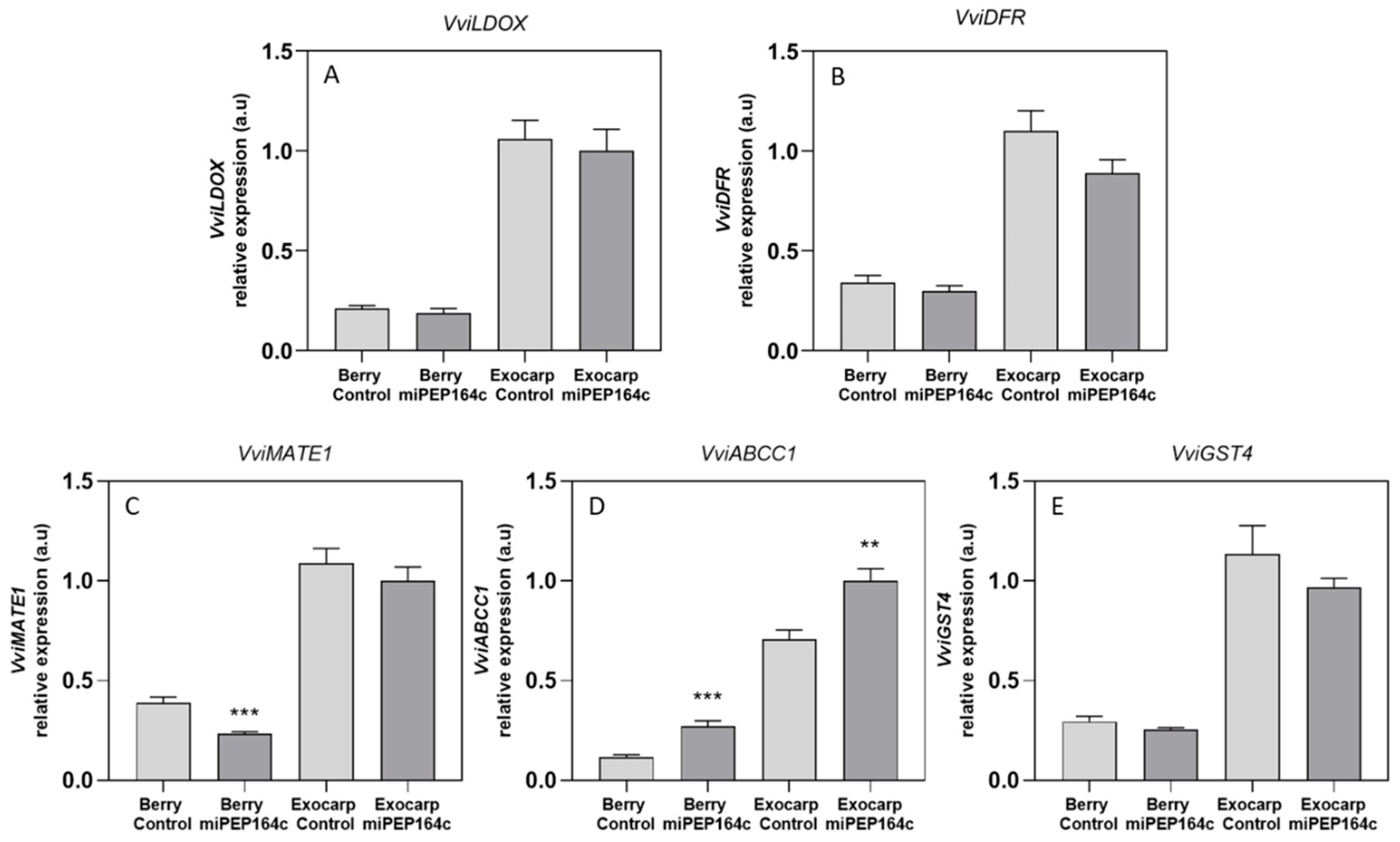 4.1. In Planta Application of miPEP164c on Grape Berries Enhances Pre-miR164c Expression, Leading to Reduced Proanthocyanidin Biosynthesis