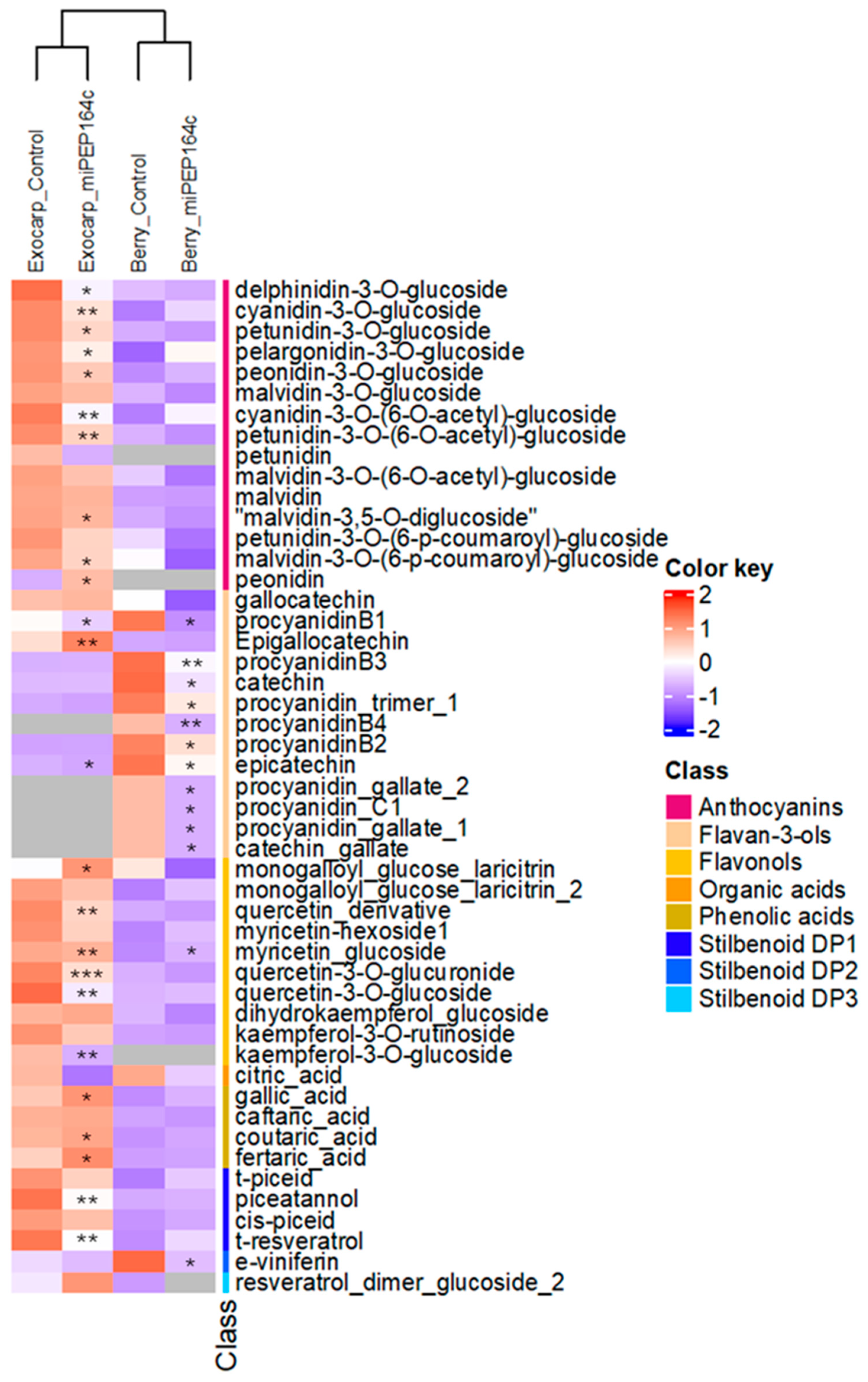 Modulation of Specialized Metabolites Induced by miPEP164c Exogenous Application in Grape Berry Clusters—An UPLC-MS-Based Metabolomics Analysis