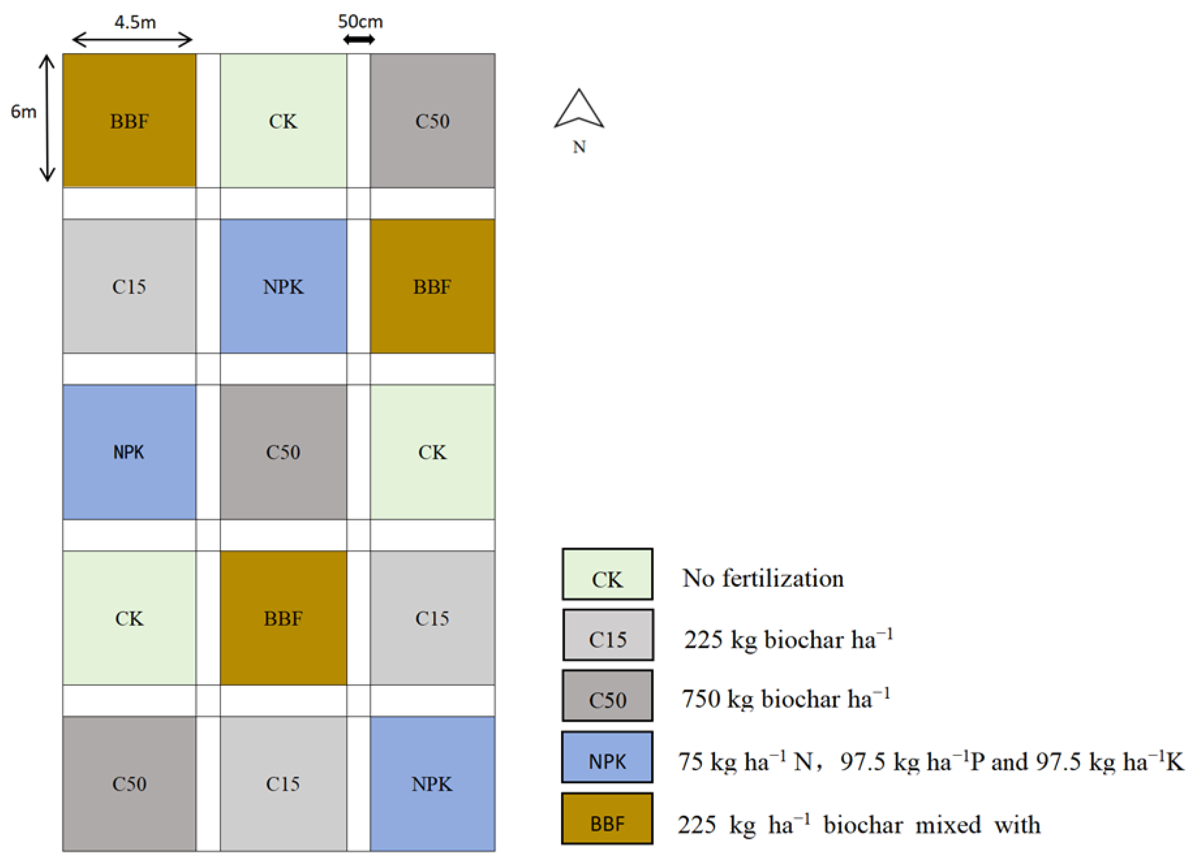 | Treatment | C (kg hm−2) | N (kg hm−2) | P2O5 (kg hm−2) | K2O (kg hm−2) |