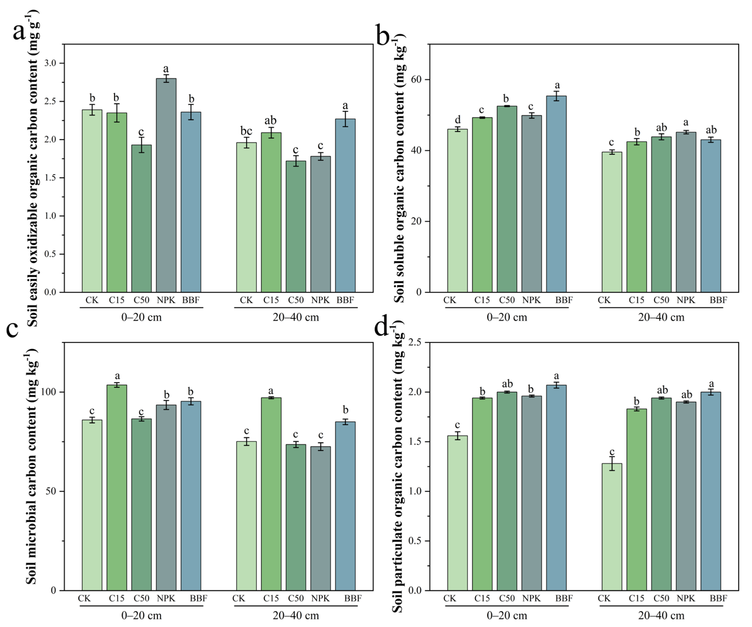 | 0–20 | CK | 75.17 ± 3.61 b | 23.66 ± 1.19 c | 72.00 ± 7.96 a | 162.18 ± 5.62 a |